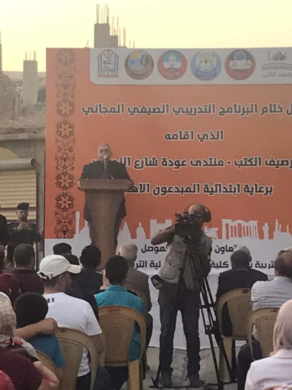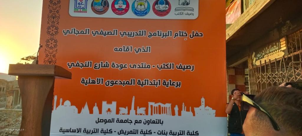 حضر السيد مساعد رئيس جامعة الموصل الاستاذ الدكتور منير سالم طه بالنيابة عن السيد رئيس جامعة الموصل الاستاذ الدكتور قصي كمال الدين الاحمدي احتفالية رصيف الكتب التي اقامها منتدى عودة شارع النجفي بمناسبة اختتام الدورة الصيفية التي اقامها المنتدى بالتعاون مع كل من كلية التمريض وكلية التربية للبنات وكلية التربية الاساسية في جامعة الموصل وهدفت الدورة الصيفية الى اشراك مجموعة من طلبة المدارس دورات في الاسعافات الاولية والتايكوندو وفعاليات اخرى برعاية من مدرسة المبدعون الاهلية وقد القى السيد المساعد العلمي لرئيس الجامعة كلمة امام الحضور اكد من خلالها نظرة الجامعة والشعار الذي رفعته بان الجامعة في خدمة المجتمع . حضر الحفل عميد كلية التمرض الاستاذ الدكتورة سلوى حازم المختار وعدد من تدريسيي الجامعة.