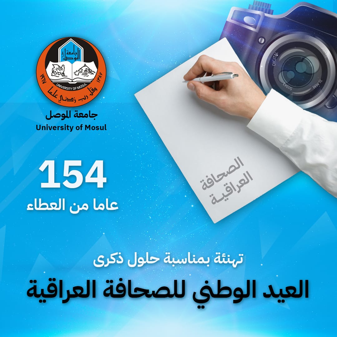 تتقدم أسرة جامعة الموصل ممثلةً برئيسها الاستاذ الدكتور قصي كمال الدين ومنتسبيها تدريسيين وموظفين وطلبة بأعطر التهاني والتبريكات الى نقابة الصحفيين العراقيين /المركز العام، وصحفيي العراق كافة وهم يواصلون مسيرتهم الإعلامية، توثيقاً للمجريات، ونقلاً أميناً للأحداث، وعيوناً ترقب وترصد لتشخص الخلل، وتعالج العثرات….