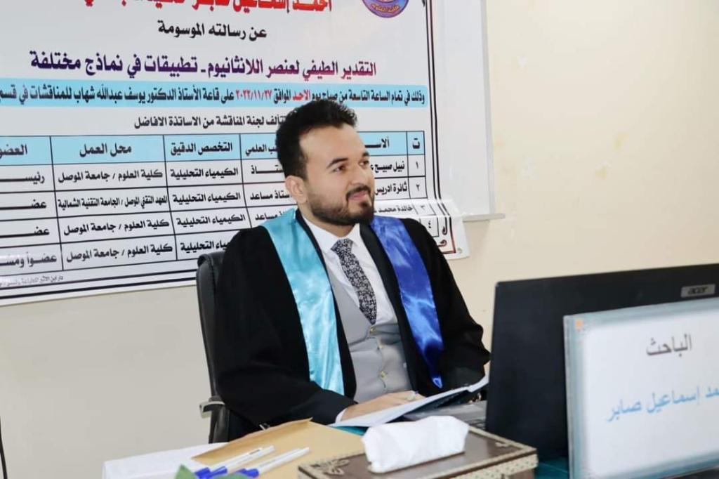 ناقشت كلية العلوم بجامعة الموصل رسالة الماجستير الموسومة ” التقدير الطيفي لعنصر اللانثانيوم-تطبيقات في نماذج مختلفة ” يوم الأحد الموافق 27 تشرين الثاني 2022.حضر جانباً منها عميد الكلية الأستاذ الدكتورة هيام عادل إبراهيم والمعاون العلمي وعدد من تدريسي الكلية .تناولت الرسالة التي تقدم بها الطالب ( أحمد إسماعيل صابر ) في فرع الكيمياء التحليلية تطوير طريقة طيفية بسيطة و سريعة وحساسة لتقدير عنصر اللانثانيوم في المحلول المائي بتفاعله مع كاشف الالزارين الأحمر اس (alizarin red S , ARS) و بوجود عامل الشد السطحي ( triton X-100) لتكوين معقد ذي لون أحمر عند دالة حامضية (pH 4.5) يظهر حزمة طيفية لها أعلى امتصاص عند الطول الموجي 523 نانوميتر مقابل المحلول الصوري .تطرقت الدراسة الى قانون بير ضمن مدى التركيز 2.5- 200 مايكروغرام من اللانثانيوم في حجم نهائي 20 مليلتر ( اي 0.125- 10 مايكروغرام /مللتر) مع امتصاصية مولاريه مساوية الى 0.72×104 لتر/مول.سم و معامل ساندل للحساسية 0.0192 مايكروغرام/سم2 وكانت قيم كل من حد الكشف وحد التقدير الكمي للطريقة مساوية الى 0.04182 و 0.04434 مايكروغرام/ مللتر على التوالي. كذلك تم حساب قيمة الاسترجاعية والخطأ ألنسبي للطريقة وكانت النتائج مساوية الى %98.8- %103.1 و%0.103-% 0.208 على التوالي ، و طبقت الطريقة بنجاح على تقدير اللانثانيوم في نماذج مائية مختلفة و في الادرار .ترأس لجنة المناقشة الأستاذ الدكتور نبيل صبيح عثمان وعضوية كل من الأستاذ المساعد الدكتورة ثائرة إدريس يونس و الأستاذ المساعد الدكتورة خالدة محمود عمر ، وبإشراف وعضوية الأستاذ الدكتور سالم علي محمد.