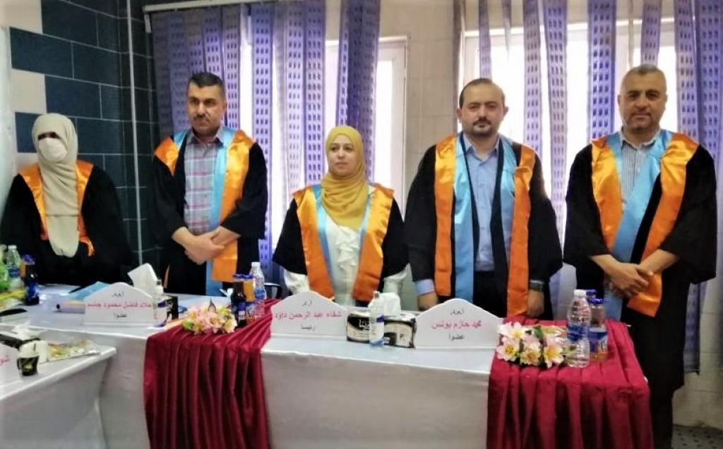 تراس لجنة المناقشة الاستاذ الدكتور شفاء عبدالرحمن داؤد وعضوية كلاً من الاستاذ المساعد الدكتور أحلام فاضل محمود والاستاذ المساعد الدكتور محمد حازم يونس عضوا وبإشراف وعضوية المدرس الدكتور شوكت صباح خيرالله.