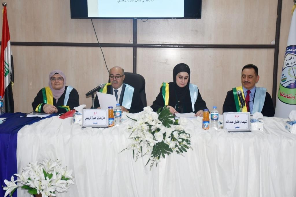 ترأس لجنة المناقشة الأستاذ الدكتور حازم عزيز حمزة الربيعي وعضوية كل من الاستاذ المساعد الدكتورة يسرى مجيد الشاكر عميد الكلية والمدرس الدكتور شيماء خليل عبد الله.