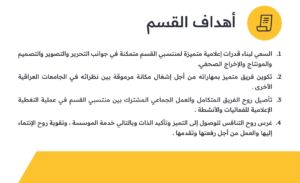 • إقامة ورش العمل والدورات التدريبية في مجال التعريف والنهوض بالإعلام لتدريب منتسبي شُعب الإعلام في كليات ومراكز الجامعة .