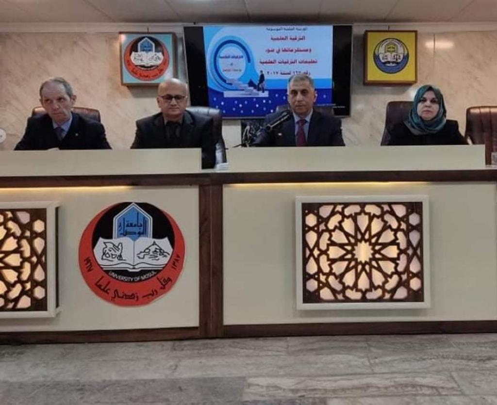 أقامت كلية الحقوق ورشة علمية يوم الاثنين الموافق ٢٠ كانون الاول ٢٠٢١ موسومة (الترقية العلمية ومستلزماتها في ضوء تعليمات الترقيات العلمية رقم ١٦٧ لسنة ٢٠١٧) قدمها فرع القانون الخاص بالتعاون مع شعبة الترقيات العلمية في رئاسة جامعة الموصل حيث قدم الاستاذ الدكتور اكرم محمود حسين احد تدريسيي فرع القانون الخاص في الكلية رئيس اللجنة المركزية للترقيات العلمية في رئاسة الجامعة شرحاً لتعليمات الترقيات العلمية رقم ١٦٧ لسنة ٢٠١٧ مع الإشارة اولا الى احصائية حول معاملات الترقيات العلمية المنجزة خلال الشهور الثلاثة الأخيرة لعام ٢٠٢١ والتي تجاوزت ١٨٠ معاملة ثم جرى تقديم شرح مفصل وتوضيحا شاملا للكتب الرسمية الواردة من وزارة التعليم العالي والبحث العلمي بخصوص الترقية العلمية الى كل مرتبة مع بيان عدد البحوث المطلوبة ضمن التخصص العام والدقيق مشيرا إلى الحالات التي يكون فيها بالإمكان تقديم الاعتراضات على قرارات لجنة الترقيات العلمية مع بيان ادوار لجنة الترقيات العلمية في الكليات كما تمت الاشارة لإمكانية ترويج معاملة ترقية علمية من قبل طالب الدراسات العليا كونه متفرغاً جزئيا للدراسة مبينا نوعية النشاطات اللاصفية والعقوبة الانضباطية التي تتعلق بموضوع الترقية العلمية والتي تؤدي إلى تأخيرها ثم بين الدكتور ليث احمد الصبحة رئيس لجنة الرصانة في اللجنة المركزية للترقيات العلمية اهمية ان يكون نشر البحوث في مجلات علمية رصينة ضمن مستوعبات اسكوبس حيث يخضع ذلك للتدقيق من لجنة الترقيات العلمية استنادا للتحديثات والتغيرات التي تطرأ على المجلة مع التأكيد ان لا تكون المجلة مختطفة او مفترسة ثم قدمت السيدة هيفاء دخيل احمد شرحا مفصلا لمتطلبات ترويج معاملة الترقية العلمية ومرفقاتها وبحوثها وكيفية ملء استمارات الجداول مؤكدة ان تنظيم وترتيب المعاملة يكون له دورا محوريا في الإسراع والتأخير ثم قدم الدكتور شامل يونس حسن شرحا حول تدقيق معاملة الترقية العلمية وآلية عرضها على اللجنة المركزية للترقيات ، وقد شهدت الورشة حضورا ملفتا ومتميزا الذي وجه العديد من الاسئلة والاستفسارات حول موضوع الورشة تمت الاجابة عليها تفصيليا من قبل القائمين عليها ،