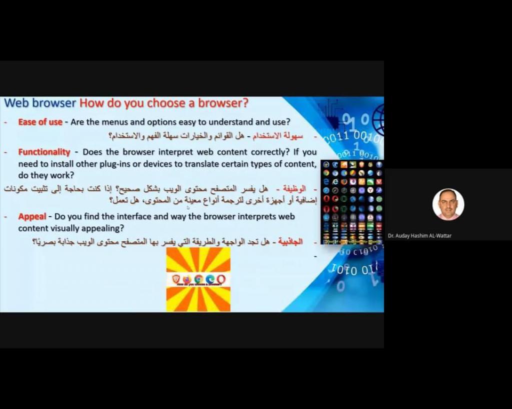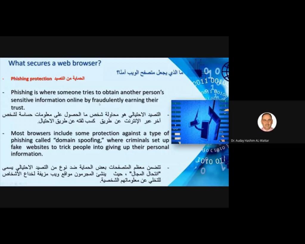 عبر الفضاء الإلكتروني يوم الأثنين 26 نيسان2021تناولت الورشة الى ماهية الامن السيبراني و ما هي مخاطر ضعفه وما الذي يمكن فعله لتوسيع نطاق الأمن السيبراني الخاص بالمستخدم وتحديد الخطوات اللازمة للدفاع عن امن المستخدم من خلال التعرف على انواع هذه المخاطر وفهمهما.تطرقت الورشة الى سرد الاجراءات الضرورية الواحب اتخاذها في سبيل تقليل مخاطر الهجمات الإلكترونية قدر الامكان والى ماهية المتصفحات الخاصة بالويب وماهي الاساليب الواجب اتباعها في اختيار المتصحف الويب الخاص بالمستخدم وكذلك بيان اهمية الامنية الخاصة بالمتصحف و لماذا تعد إعدادات الأمان لمتصفحات الويب مهمة جدا .تضمنت الورشة توضيحا لأمن متصفح الويب بصورة مفصلة ومالذي يجعل متصفح الويب امنا بالاضافة الى شرح كيفية بقاء المستخدم آمنًا عبر الإنترنت باستخدام اي متصفح.اختتمت الورشة بعرض امثلة عن متصفحات الويب المستخدمة حاليا بأحدث الإصدارات والمقارنة بينها وذكر الايجابيات والسلبيات لكل واحدا منها.