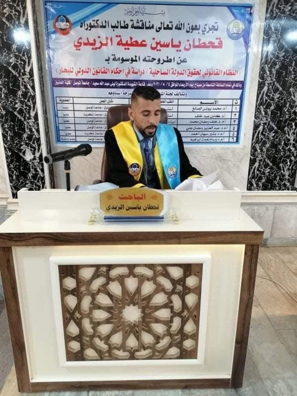 ناقشت كلية الحقوق بجامعة الموصل اطروحة دكتوراه عن النظام القانوني لحقوق الدولة الساحلية/دراسة في احكام القانون الدولي للبحار يوم الاربعاء 4 آب 2021 .تناولت الدراسة التي تقدم بها الطالب قحطان ياسين عطية في فرع القانون العام البحار التي تشكل مساحتها ثلاثة ارباع الكرة الارضية ومن ثم فهي مكون رئيسي لكوكب الارض ووسط بيئي له اهميته في حياة الانسان حيث ان البحار تعد من المواضيع الحساسة في ميدان العلاقات الدولية كونها وسيلة اتصال ومصدرا للغذاء الخارجي لكثير من الدول لذلك فإن الطبيعة المزدوجة لوظيفة البحار كمصدر للثروات ومصدر للخطر الخارجي كانت ولا تزال الهاجس الاهم في تنظيم شؤون البحار .تهدف الدراسة الى بيان اهمية البحار الستراتيجية التي شكلت مصدرا للصراع بين وجهتي نظر متعارضتين عندما حاولت بعض الدول مدعومة بأراء بعض الفقهاء ادعاء فرض سيادتها على البحار على اساس ان البحار تقبل الحيازة مثلها في ذلك مثل الاقاليم البرية فيما تصدت دول اخرى يؤازرها في ذلك اتجاه فقهي دولي يبحث عن المصالح المتبادلة بين الدول المشتركة في استغلال البحر على قدم المساواة .ترأس لجنة المناقشة الاستاذ الدكتور محمد يونس يحيى وعضوية كلاً من الدكتور كامل عبد خلف والدكتور خلف رمضان محمد والدكتور عبدالعزيز رمضان علي والدكتور بشير سبهان احمد وعضوية واشراف الدكتور وسام نعمت ابراهيم السعدي