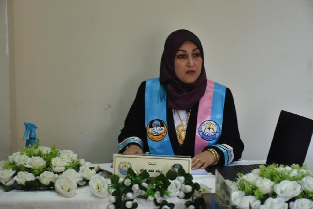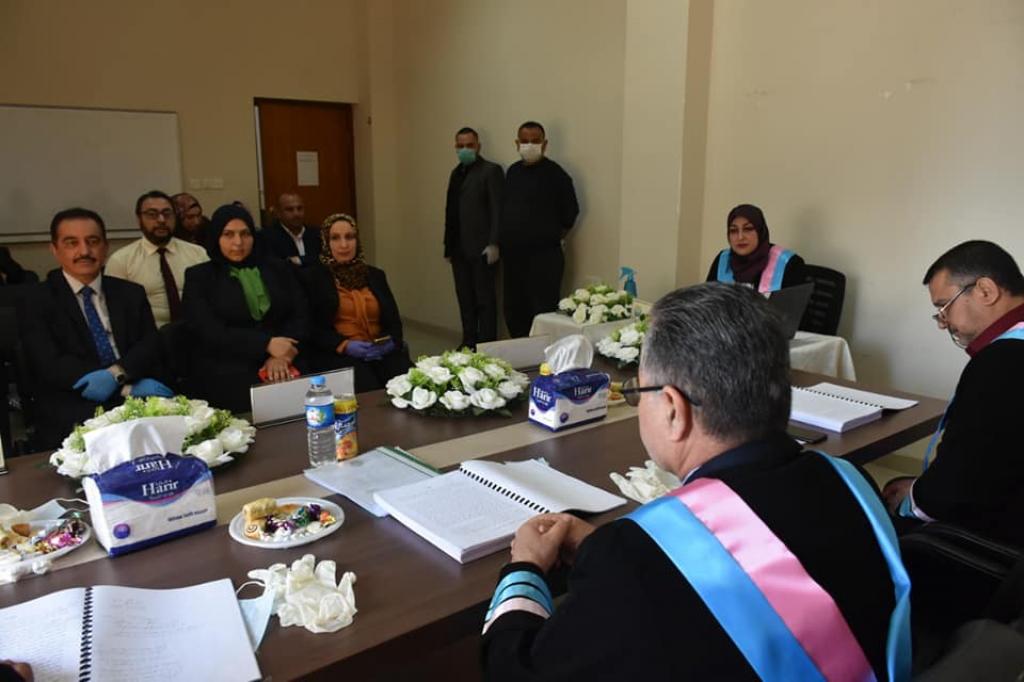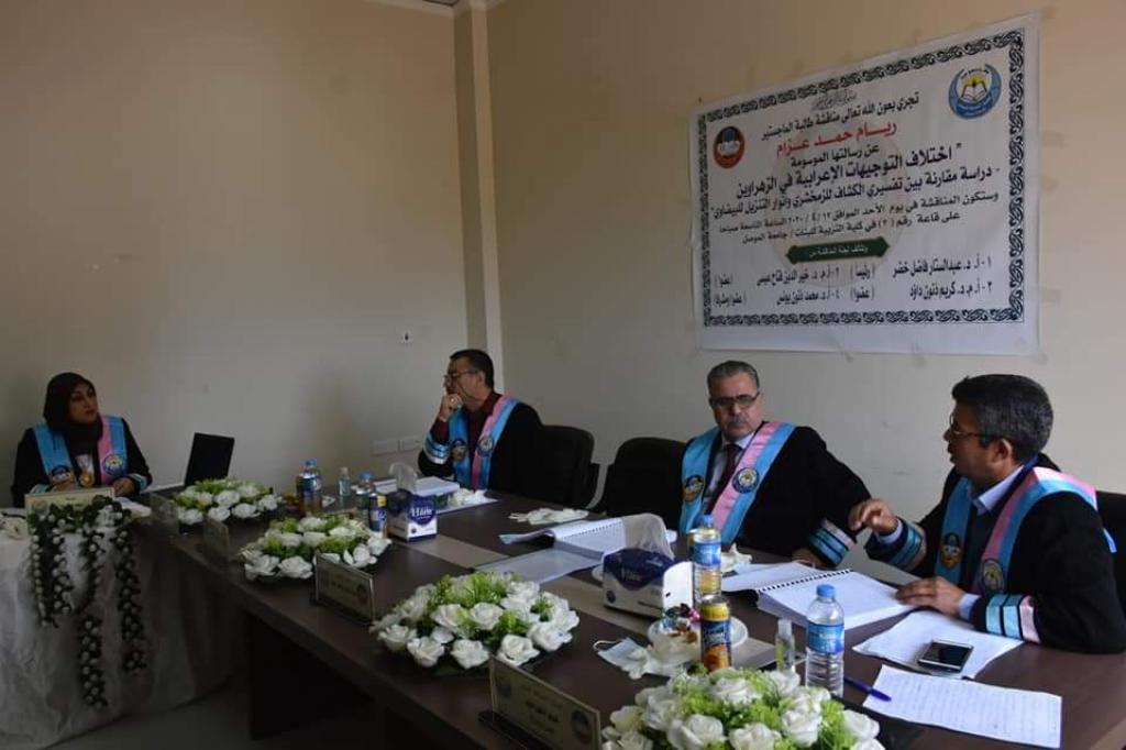 من اجل تقديم الدعم المعنوي الى طلبة الدراسات العليا في جامعة الموصل، حضور جانب من مناقشة رسالة الماجستير للطالبة ريام حمد عزام الموسومة (اختلاف التوجيهات الاعرابية في الزهراوين).حيث جرت المناقشة في قاعة كلية التربية للبنات عبر منظومة الانترنيت (ONLINE) بالنسبة للمناقش الخارجي وحضور السادة المناقشين