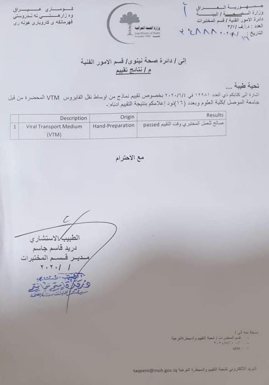 حصلت جامعة الموصل على إعتماد مختبرات وزارة الصحة العراقية للوسط الناقل لفحوصات فايروس كورونا (Virus transfer media) (VTM) والذي تم تحضيره في مختبرات الجامعة بحسب الكتاب الوارد من وزارة الصحة المرقم ( د.أ.ف./٧/٣) بتاريخ ١٦ أب/ ٢٠٢٠، والذي يؤكد صلاحية هذه الأوساط للعمل المختبري، علما بأن الاوساط المصنعة في جامعة الموصل هي الوحيدة الحاصلة على الاعتمادية من وزارة الصحة.