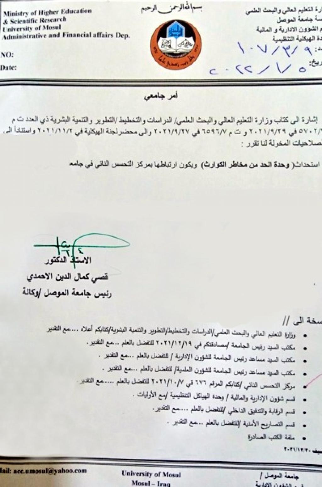 في مضمار التسابق العلمي لمركز التحسس النائي في خدمة المحافظة وفي مجال درء الكوارث والازمات والحد من اثارها، ولما يتمتع به المركز من امكانيات وخبرات علمية في هذا المجال كان اخرها تنظيمه لمؤتمر علمي للحد من مخاطر الكوارث، وبناءا على المخاطبات الرسمية بين وزارة البيئة ووزارة التعليم العالي والبحث العلمي فقد اوعزت الوزارة باستحداث وحدة بحثية تحت مسمى (وحدة الحد من مخاطر الكوارث) في الجامعات العراقية لمواكبة التطورات في تحقيق اهداف التنمية المستدامة المتفق عليها في كثير من دول العالم، وقد قامت جامعة الموصل باستحداث هذه الوحدة في مركز التحسس النائي وصدر الامر الجامعي المرقم 9/3/107 في 5/1/2022.الخاص بإنشاء هذه الوحدة .