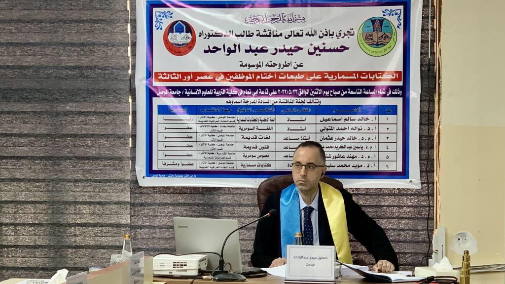 ناقشت كلية الاثار في جامعة الموصل اطروحة الدكتوراه الموسومة(الكتابات المسمارية على طبعات اختام الموظفين في عصر اور الثالثة)، يوم الاثنين 23 أيار 2022.تناولت الدراسة التي تقدم بها حسنين حيدر عبد الواحد في قسم اللغات العراقية القديمة وظائف تخص العمل الاداري حيث ظهر خلال عصر أور الثالثة وعلى المستوى الإداري في إدارة شؤون الدولة التخصص في العمل الوظيفي وبروز وظائف جديدة لم تكن معروفة خلال العصور السابقة وتخصص وظائف أخرى بتفاصيل أدق في مجال عملها،تطرقت الدراسة الى اعتبار عصر أور الثالثة أكثر العصور غزارة في أعداد الرقم الطينية التي جاءت من مختلف المدن السومرية، وفي مقدمتها مدن أور وأوما ودريهم والتي غلب على مضمونها الطابع الاقتصادي والإداري.توصلت الدراسة الى احتواء طبعات الأختام الموثِقة للنصوص المسمارية معلومات قيمة عن طبيعة الوظائف الإدارية خلال عصر أور الثالثة بالاستناد إلى تحليل النص المسماري المدون على طبعات أختام هؤلاء الموظفين، إذ ضم النص المدون على طبعة الختم أسماء الملوك والحكام إلى جانب أسماء الموظفين وعناوين وظائفهم وأسماء المدن التي مارسوا وظائفهم فيها فضلاً عن العبارات التبجيلية تجاه ملوكهم.ترأس لجنة المناقشة :الاستاذ