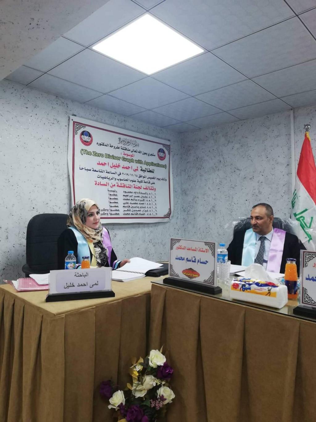 نوقشت في قسم علوم الرياضيات بكلية علوم الحاسوب والرياضيات في جامعة الموصل اطروحة الدكتوراه الموسومة “The Zero Divisor Graph with Applications ” للطالبة (لمى خليل احمد) .وهدفت الاطروحة الى تسليط الضوء على الدرجة العظمى لبيان قواسم الصفر واعطاء بعض خواصه، بالإضافة إلى اعطاء تصنيف لدالتي گاما وايجاد عدد الرؤوس والعدد اللوني والرتبة والحجم وقد تم كذلك ايجاد متعدد هوسويا، دليل وايتر،ومتعدد حدود كوشي شوارتز للبيانين.