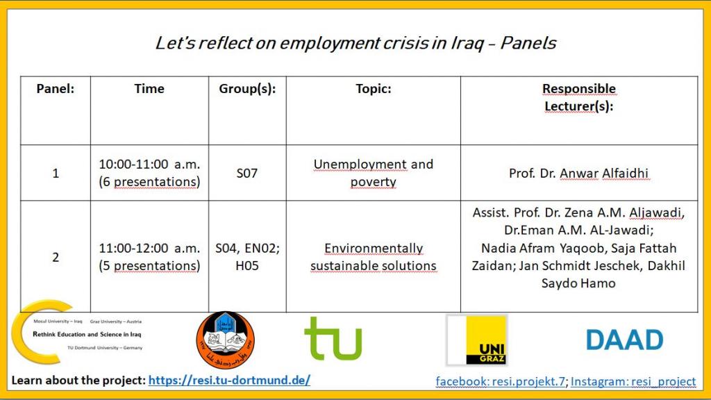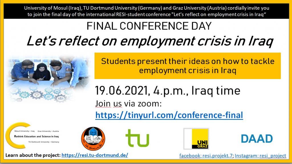 University of Mosul, TU Dortmund University and Graz University cordially invite you to join the final day of the international RESI-student conference “Let’s reflect on employment crisis in Iraq”.