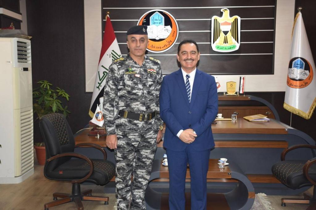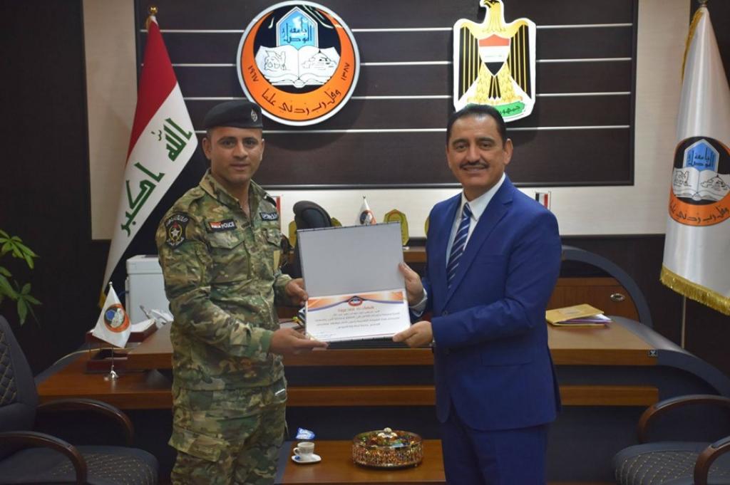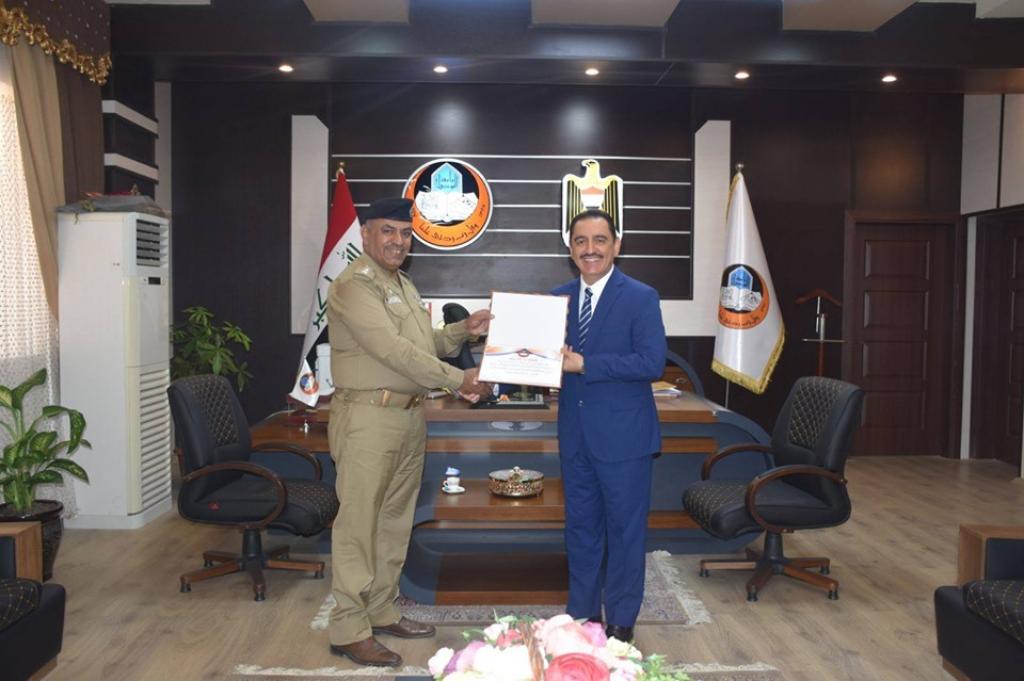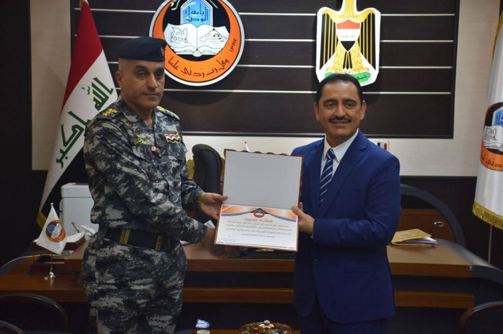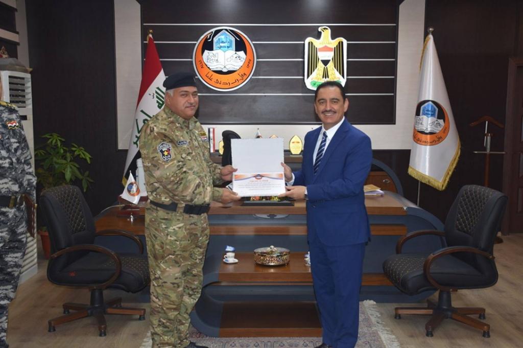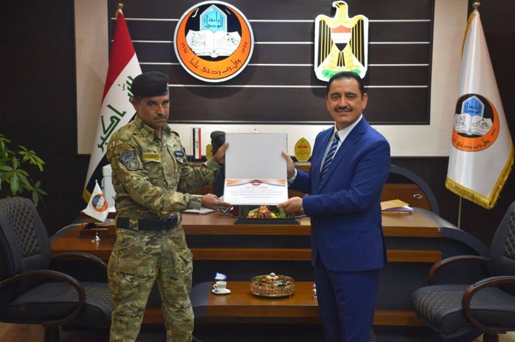 في سعيه المتواصل لمتابعة كل مفصل من مفاصل الجامعة كرم الاستاذ الدكتور قصي كمال الدين الاحمدي رئيس جامعة الموصل صباح يوم الاربعاء الموافق 16 تشرين الاول 2019 في مكتبه الرسمي مدير قوة حماية الجامعة ومنتسبيه بشهادات تقديرية وكتب شكر عرفاناً من رئاسة جامعة الموصل لجهودهم المبذولة في حماية كل ابنية ومنشأت وممتلكات الجامعة ومواصلة عملهم على مدار الساعة ومثمناً بالوقت نفسه جهود مديرية حماية منشأت نينوى بدعمها للقوة المكلفة بحماية الجامعة وتوفيرها مستلزمات نجاح عملهم .وبدوره شكر امر القوة السيد رئيس جامعة الموصل على هذه الالتفاتة الكريمة من سيادته وان ذلك سيزيد من عزم منتسبيه على اداء واجبهم بشكل افضل خدمة لمدينتهم وجامعتها .