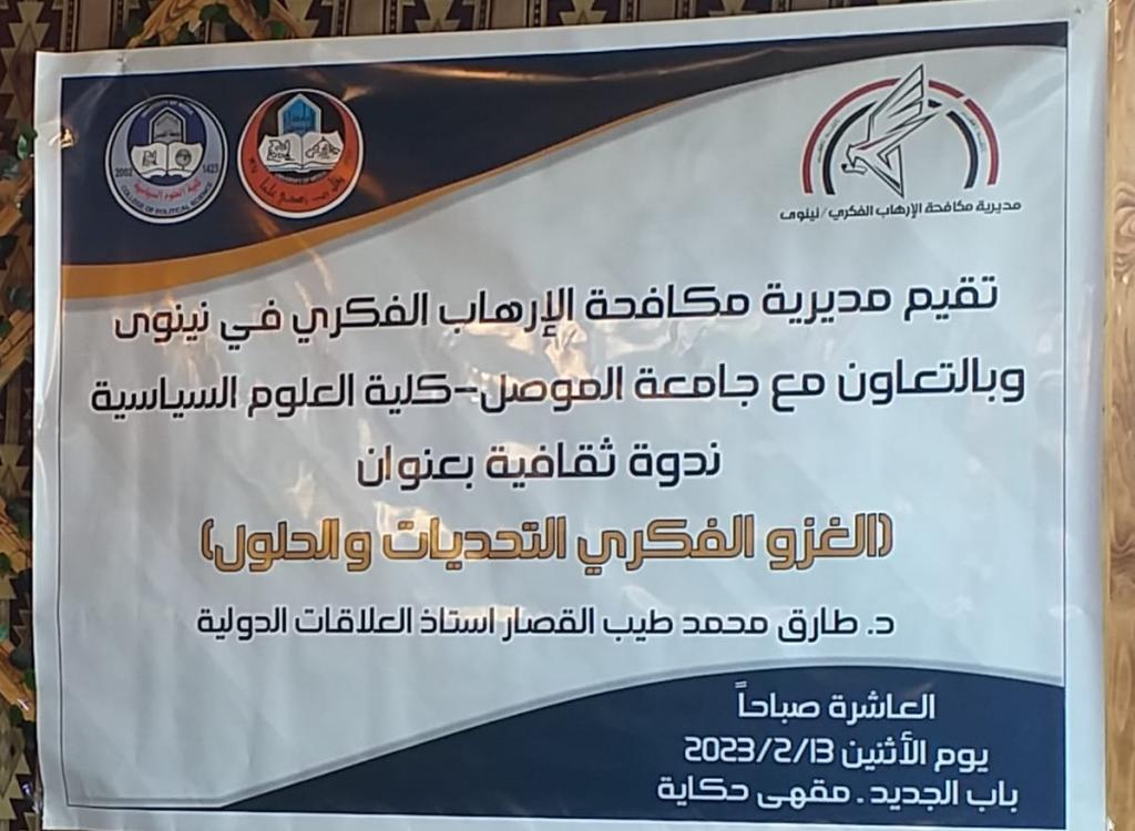 تنفيذا لتوجيهات السيد رئيس جامعة الموصل الاستاذ الدكتور قصي كمال الدين الاحمدي بضرورة توجيه انشطة الجامعة نحو خدمة المجتمع وبالتعاون مع مديرية مكافحة الارهاب الفكري في محافظة نينوى ، اقامة كلية العلوم السياسية صباح يوم الاثنين /١٣شباط ٢٠٢٣ وفي منطقة باب الجديد في ايمن الموصل الندوة العلمية الموسومة