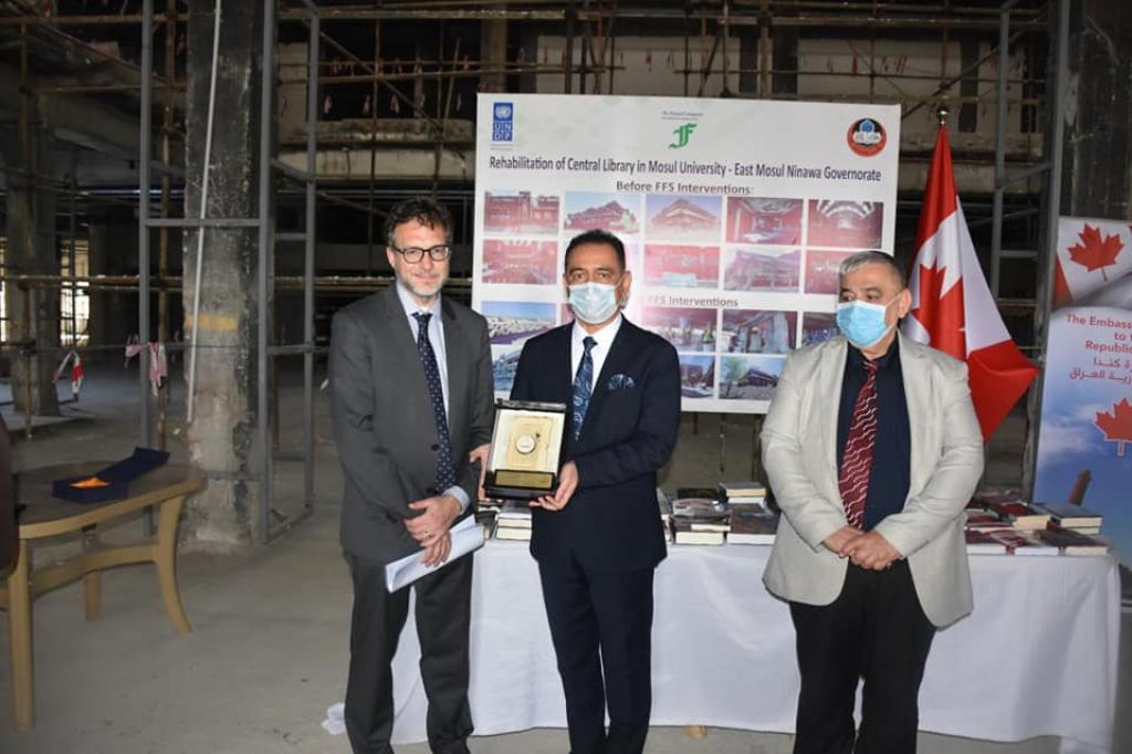 وتابع سعادته قائلاً (اردت ان ابدي لفتة رمزية لتضامن كندا مع جامعة الموصل من خلال منح المكتبة اليوم مجموعة من الكتب الكندية التي تمثل مجموعة اساسية من الكتب حول تاريخ كندا وتراثها وادبها باللغتين الانكليزية والفرنسية اتمنى ان تشكل بداية تأسيس الركن الكندي الذي نامل في بناءه في المكتبة خلال السنوات القادمة ).