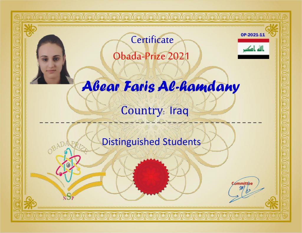 حصدت الطالبة في المرحلة الأولى، عبير فارس الحمداني من كلية الطب / جامعة الموصل المركز الأول لجائزة عُبادة الدولية للبحوث المبتكرة Obada Prize Distinguished Students International للعام الدراسي ٢٠٢١ بعد مشاركتها بمشروع البحث الموسوم: The Effects of Selected Toothpaste, Antibiotics and Miswak on the Bacteria Isolated From the Human Oral Cavity (تأثيرات اختيار معجون الأسنان والمضادات الحيوية والمسواك على الجراثيم المعزولة من الفم).تم في هذه الدراسة استخدام خمسة أنواع مختلفة من معاجين الأسنان، وخمسة انواع من المضادات الحيوية ومسواك للتحقيق في تأثيرها على البكتيريا المعزولة من تجويف الفم البشري.وتمّ التوصل إلى أنّ معجون الاسنان Colgate كولجيت هو الأكثر فعالية مقارنةً بالأنواع الأخرى من المعاجين. بينما كان للسواك تأثيرٌ فعال على ايقاف نمو البكتيريا. في حين أظهرت المضاداتُ الحيوية المستخدمة كفاءةً أقل في الحد من نمو البكتيريا مقارنة مع المعاجين.تعد هذه الجائزة دولية، تعترف وتشجع البحوث المبتكرة ومتعددة التخصصات التي تتخطى الحدود والنماذج التقليدية، وتُدعم من أكاديمية العلوم الافريقية.وتتضمن الجوائز ثلاث فئات: الأولى للباحث المتميز، والثانية للباحثين الذين تقل أعمارهم عن أربعين سنة، والثالثة لطلبة البكالوريوس والدراسات العليا.مُنحت الجوائز لخمسة وعشرين باحثاً على مستوى العالم من دول أمريكا وكندا وبريطانيا وبلجيكا وتونس وباكستان ونيجيريا والسعودية ومصر، إضافة للعراق الذي مثلتهُ طالبة كلية الطب جامعة الموصل خيرَ تمثيل وفازت بالمرتبة الأولى عن الفئة الثالثة.