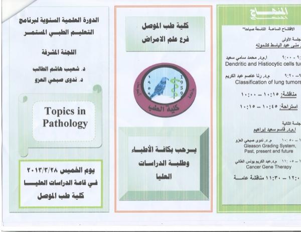 يقيم فرع الأمراض في كلية طب الموصل / جامعة الموصل وضمن برنامج التعليم المستمر دورة علمية بعنوان ( آخر المستجدات في علم الأمراض ) بتاريخ 28 / 3 / 2013 في عمادة الكلية .. تتضمن الدورة جلستان الأولى برئاسة الدكتورة منى عبدالباسط كشمولة يحاضر فيها الدكتور محمد سامي سعيد والدكتورة رنا عاصم عبدالكريم فيما يترأس الجلسة الثانية الدكتور قاسم سعيد إبراهيم يحاضر فيها الدكتورة ندوى صبحي العزو والدكتور عبدالكريم يونس الطائي .
