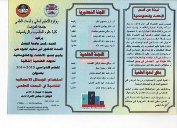 يقيم قسم الاحصاء والمعلوماتية في كلية علوم الحاسوب والرياضيات بجامعة الموصل الندوة العلمية الثانية للعام الدراسي 2013 – 2014 بعنوان ” استخدام الوسائل الاحصائية المناسبة في البحث العلمي ” بتاريخ 16 / 4 / 2014 برعاية الأستاذ الدكتور أبي سعيد الديوه جي رئيس جامعة الموصل وهذه الندوة ضمن ثلاث محاور هي : – اهمية العلوم الاحصائية ودورها الريادي في المجتمع المعرفي والجامعات المنتجة ، والوقوف على اهم المشاكل التي تعتري العمل الاحصائي في المؤسسات الاكاديمية والرسمية ، واستخدام الاساليب الاحصائية المناسبة التي تضمن تحقيق الاهداف المرجوة في مجالات البحث العلمي ..