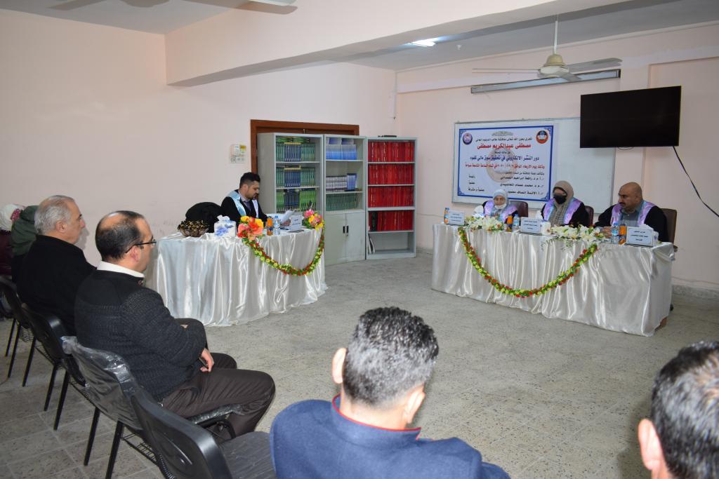 ناقشت كلية الادارة والاقتصاد بحث دبلوم عالي عن عن دور النشر الالكتروني في تحقيق السوق المالي الكفء، يوم الاربعاء الموافق 9كانون الاول2020 ، في قاعة قسم العلوم المالية والمصرفية بالكلية .