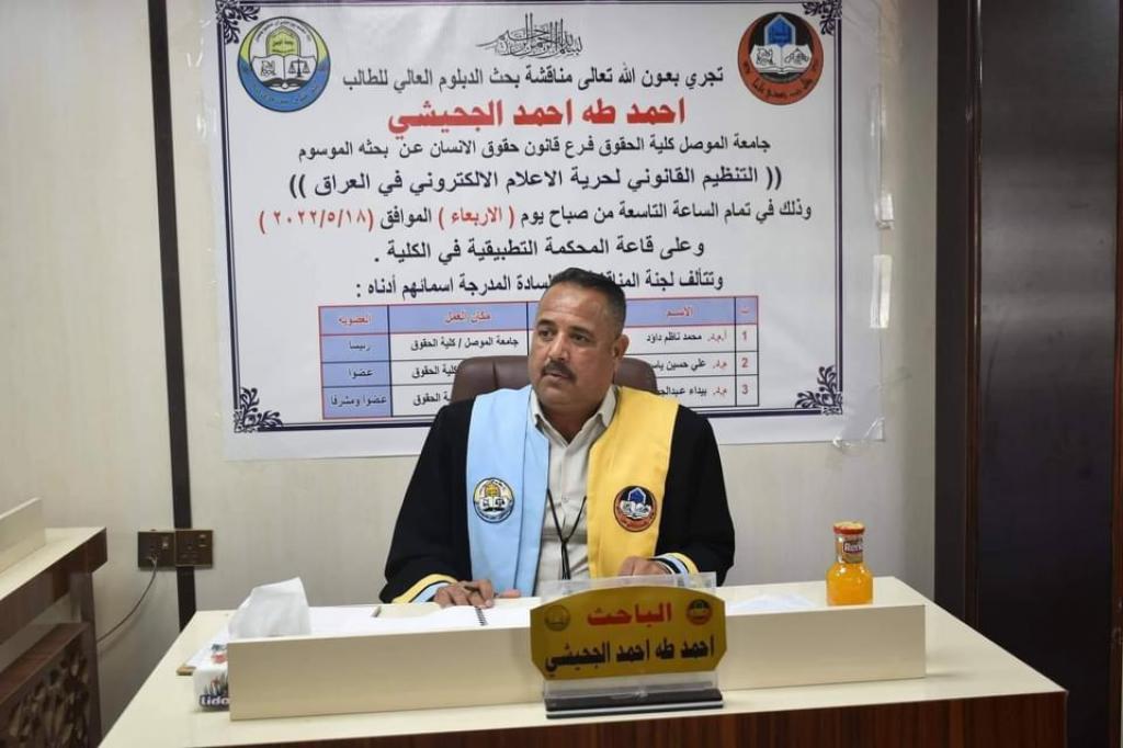 ناقشت كلية الحقوق بجامعة الموصليوم بحث الدبلوم العالي عن التنظيم القانوني لحرية الاعلام الالكتروني في العراق ، يوم الاربعاء ١٨ أيار ٢٠٢٢، حضر جانبا منها عميد الكلية وعدد من اعضاء مجلس الكلية وتدريسييها .تناول البحث الذي تقدم به الطالب احمد طه احمد في فرع قانون حقوق الانسان حرية الاعلام التي تعد من الحريات التي لا توجد الا في البلد الحر ومع التطور التقني الذي شهده العالم وظهور الانترنيت .تطرق البحث الى حرية تناقل الاخبار والمعلومات التي تمارس في جميع المؤسسات الاعلامية او من يمثلها من الاعلاميين .يهدف البحث الى بيان ان حرية الاعلام الالكتروني هي من الحريات الاساسية الفكرية وهي إحدى مظاهر حرية الرأي والتعبير فهي حرية تمنح للصحفيين والاعلاميين يقصد بها تحرر الاعلامي او الصحفي من اي قيود في تناقل الاخبار والمعلومات عبر الوسائل التقنية الحديثة او قدرة الاعلامي على نشر وتناقل الاخبار والمعلومات وايصالها للناس بمصداقية عبر الانترنيت .ترأس لجنة المناقشة الاستاذ المساعد الدكتور محمد ناظم داؤد وعضوية المدرس الدكتور علي حسين ياسين وباشراف وعضوية المدرس الدكتورة بيداء عبدالجواد محمد .