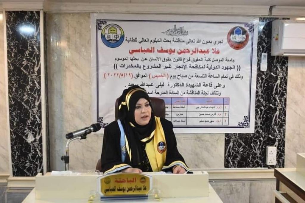 ناقشت كلية الحقوق بجامعة الموصل بحث الدبلوم العالي عن الجهود الدولية لمكافحة الاتجار غير المشروع بالمخدرات ، يوم الخميس ١٩ أيار ٢٠٢٢ ، حضر جانبا منها عميد الكلية وعدد من اعضاء مجلس الكلية وتدريسييها .تناول البحث الذي تقدمت به الطالبة علا عبدالرحمن يوسف في فرع قانون حقوق الانسان ظاهرة الاتجار غير المشروع بالمخدرات التي تعد من اهم الظواهر الخطرة التي كانت ومازالت تهدد المجتمع والتي تحتل مكانة متقدمة من بين المشاكل التي تواجه العالم المعاصر .تطرق البحث الى الأبعاد المدنية والصحيةوالاقتصادية وكان من الضروري على الدول ان تواجه هذه الظاهرة بكل الطرق والوسائل الممكنة للحد منها .تهدف الدراسة الى بيان ان الاتجار الغير المشروع بالمخدرات له دور رئيس ومهم في معالجة ظاهرة المخدرات ، وأن الاثار المترتبة على الحيازة او الاحراز بهدف الاتجار بصورة غير مشروعة هي واحدة والعقوبة المفروضة هي واحدة وهذا ما سار عليه المشرع العراقي .ترأس لجنة المناقشة الاستاذ المساعد الدكتورة شيماء عبدالستار جبر وعضوية المدرس الدكتور فارس محمد حسين وباشراف وعضوية الاستاذ المساعد الدكتورة سهى حميد سليم .