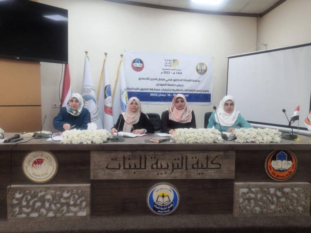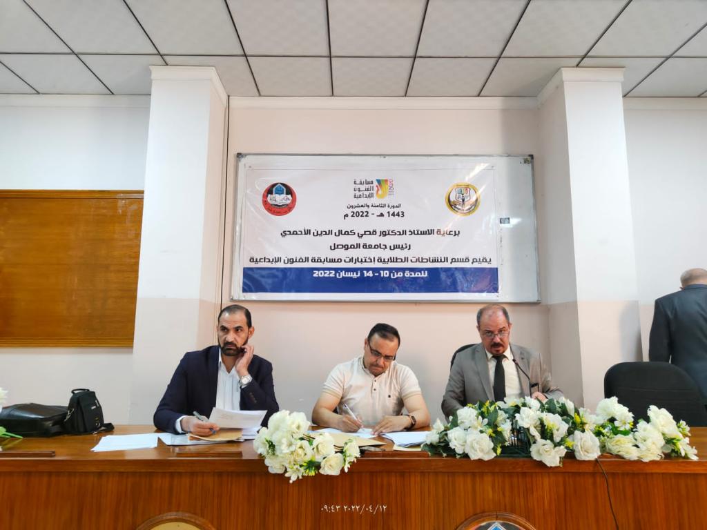 برعاية الأستاذ الدكتور قصي كمال الدين الاحمدي رئيس جامعة الموصل ، اجرت اللجان التحكيمية المختصة الاختبارات الحضورية للمشاركين من الطلبة والمنتسبين في مسابقة الفنون الإبداعية والتي يقيمها قسم النشاطات الطلابية في رئاسة الجامعة ، شملت الاختبارات الأعمال الايمانية تلاوة وحفظ وإنشاد للذكور في قاعة كلية العلوم الإسلامية وللإناث في قاعة كلية التربية للبنات فضلا عن اجراء الاختبارات الفنية عروض مسرحية وموسيقى وغناء في مسرح كلية الفنون الجميلة واختبارات الأعمال الأدبية شعر وخطابة في قاعة كلية الآداب .يشار الى ان الاختبارات ستستمر لغاية 2022/4/14 فيما سيتم تقييم الاعمال الاخرى المشاركة بمختلف الفنون دون حضور اصحابها عن طريق محكمين مختصين .
