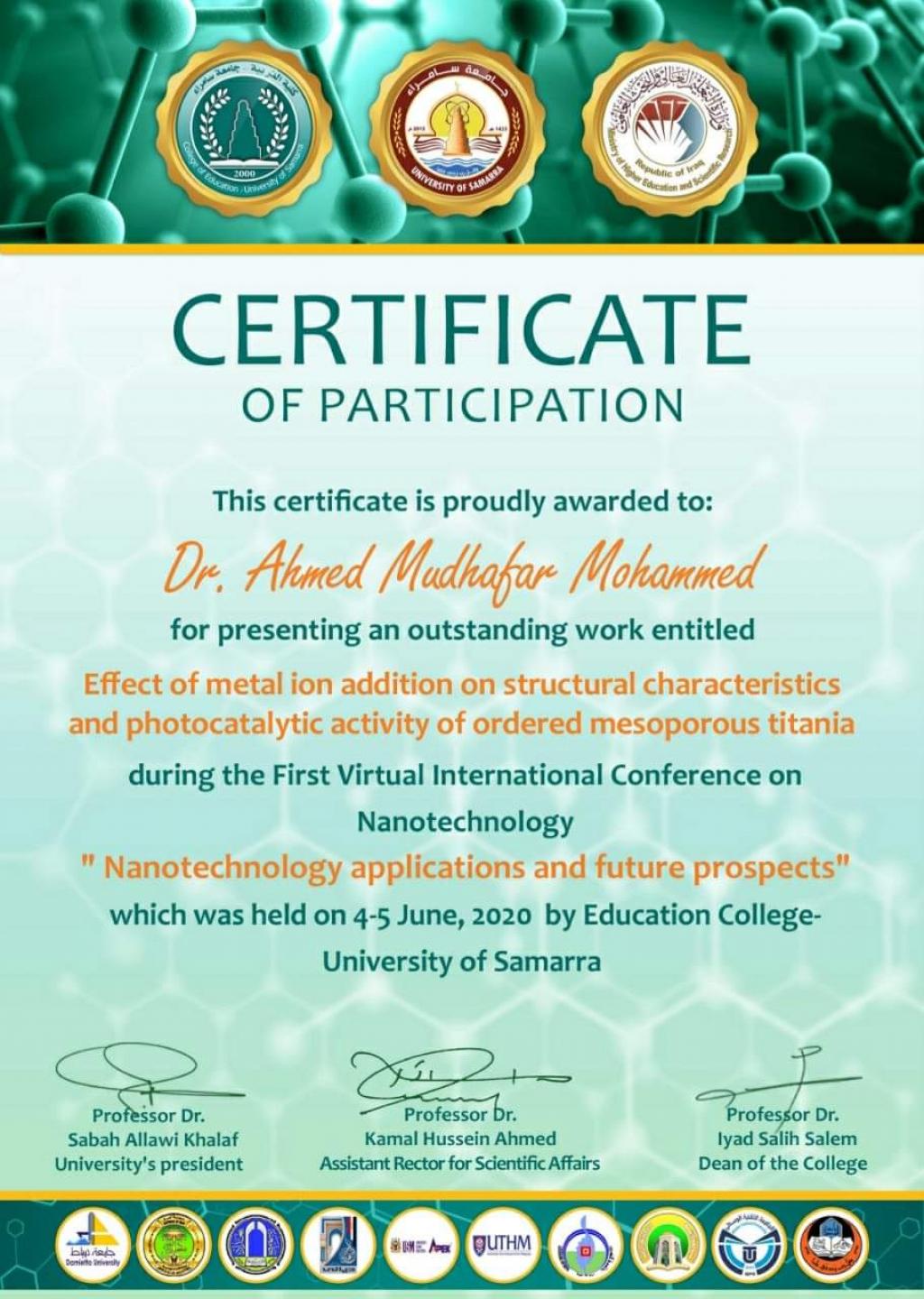 كما قدم الدكتور أحمد مظفر محمد بحثه الموسوم (Influence of metal ion addition on structural characteristics and photocatalytic activity of ordered mesoporous titania). والمنشور في مجلة علمية عالمية (Journal of Sol-Gel Science and technology) مصنفة ضمن المستوعب العلمي سكوبس، أشار فيه الى اهمية المواد النانوية المتقدمة والتي تكون بصيغة (Ordered mesoporous structure ) وتطبيقاتها في مجال تفاعلات التحفيز الضوئي، وبين في تقديمه تأثير ايونات الفلز على مادة التيتانيوم المحضرة بصغة الـ(Ordered ….) اضافةً الى ذلك تأثير هذه الايونات على فعالية التحفيز الضوئي للتيتانيا من خلال اختبار هذه المواد بقضائها وازالتها لملوث خطير من ملوثات الماء وهو مركب الفينول.