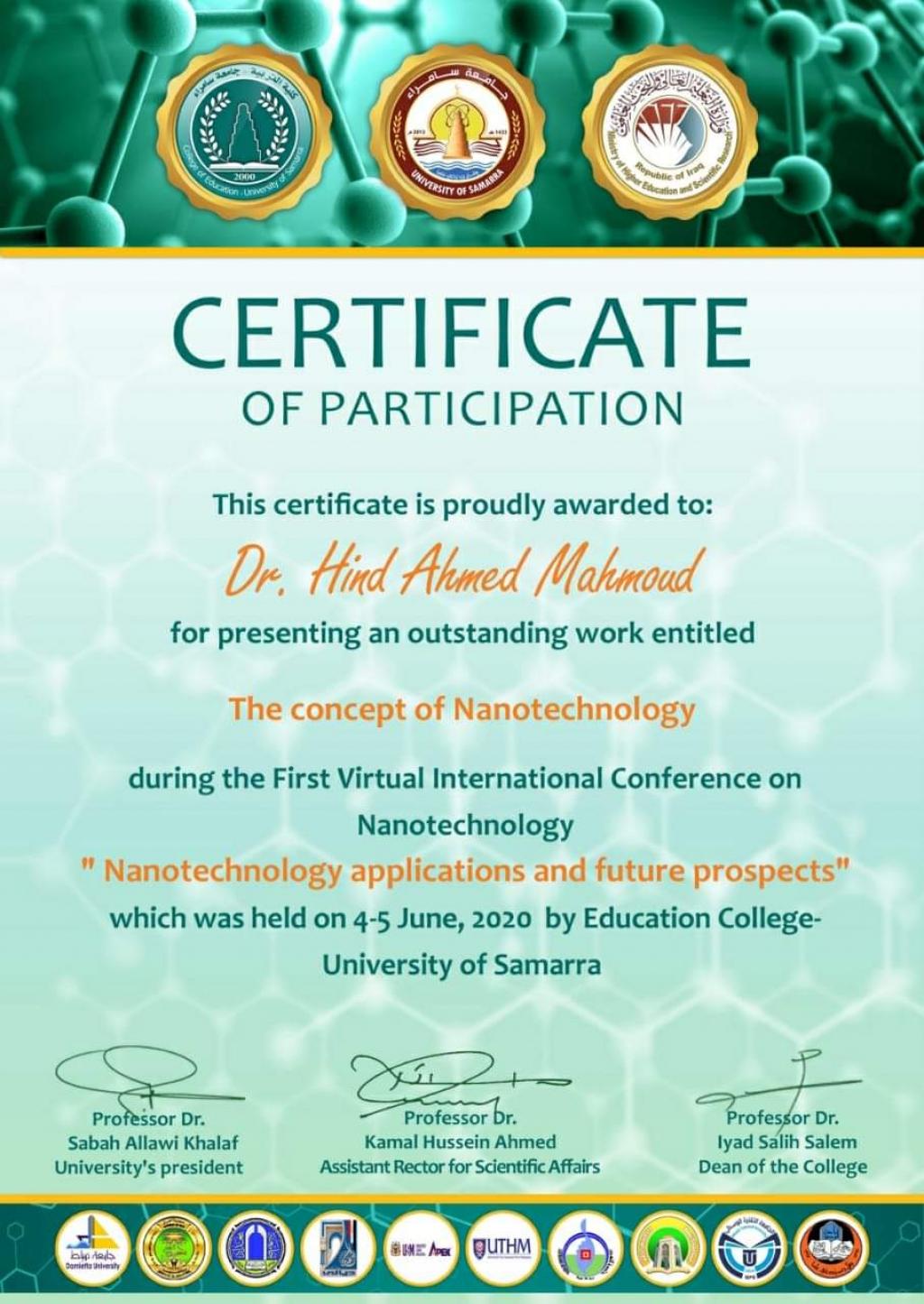 شاركت الدكتورة هند احمد محمود والدكتور أحمد مظفر محمد التدريسيين من قسم الكيمياء بكلية التربية للبنات في جامعة الموصل بأعمال اللجنة التحضيرية المركزية للمؤتمر العلمي الدولي الافتراضي الاول لكلية التربية في جامعة سامراء والذي أُقيمَ تحت عنوان (علم النانو تكنولوجي – التطبيقات والآفاق المستقبلية) للمدة ٤-٥ حزيران ٢٠٢٠، فضلا عن مشاركة كل منهما ببحث علمي في المؤتمر ، بحضور عميد كلية التربية للبنات في جامعة الموصل وعدد من تدريسيي الكلية والجامعات العراقية والعربية.