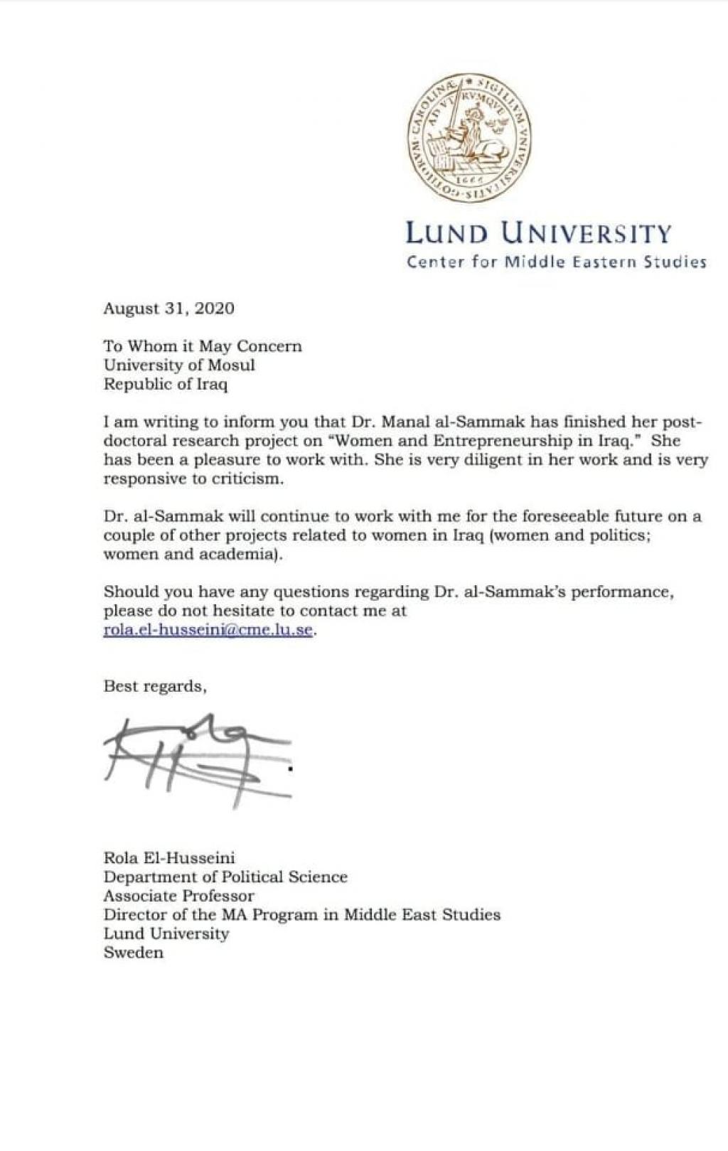 حصلت الدكتورة منال السماك التدريسية في كلية العلوم السياحية والاستاذ الزائر في جامعة لوند السويدية على شهادة ما بعد الدكتوراه بعد التفرغ العلمي الذي حصلت عليه لمدة عام في مركز دراسات الشرق الاوسطCEMS) ) التابع لجامعة لوند السويدية والذي يختص بكل ما يتعلق ببحوث الشرق الاوسط.
