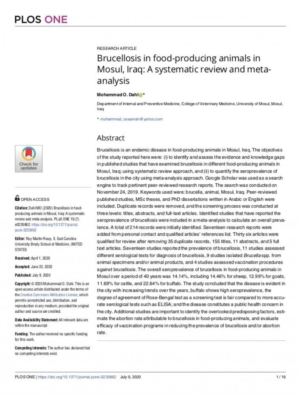 نشر التدريسي بكلية الطب البيطري في جامعة الموصل محمد أسامة عبد المجيد بحثاً علمياً في مجلة PLOS ONE التي تصدر عن Public Library of Science في سان فرانسيسكو/كاليفورنيا.