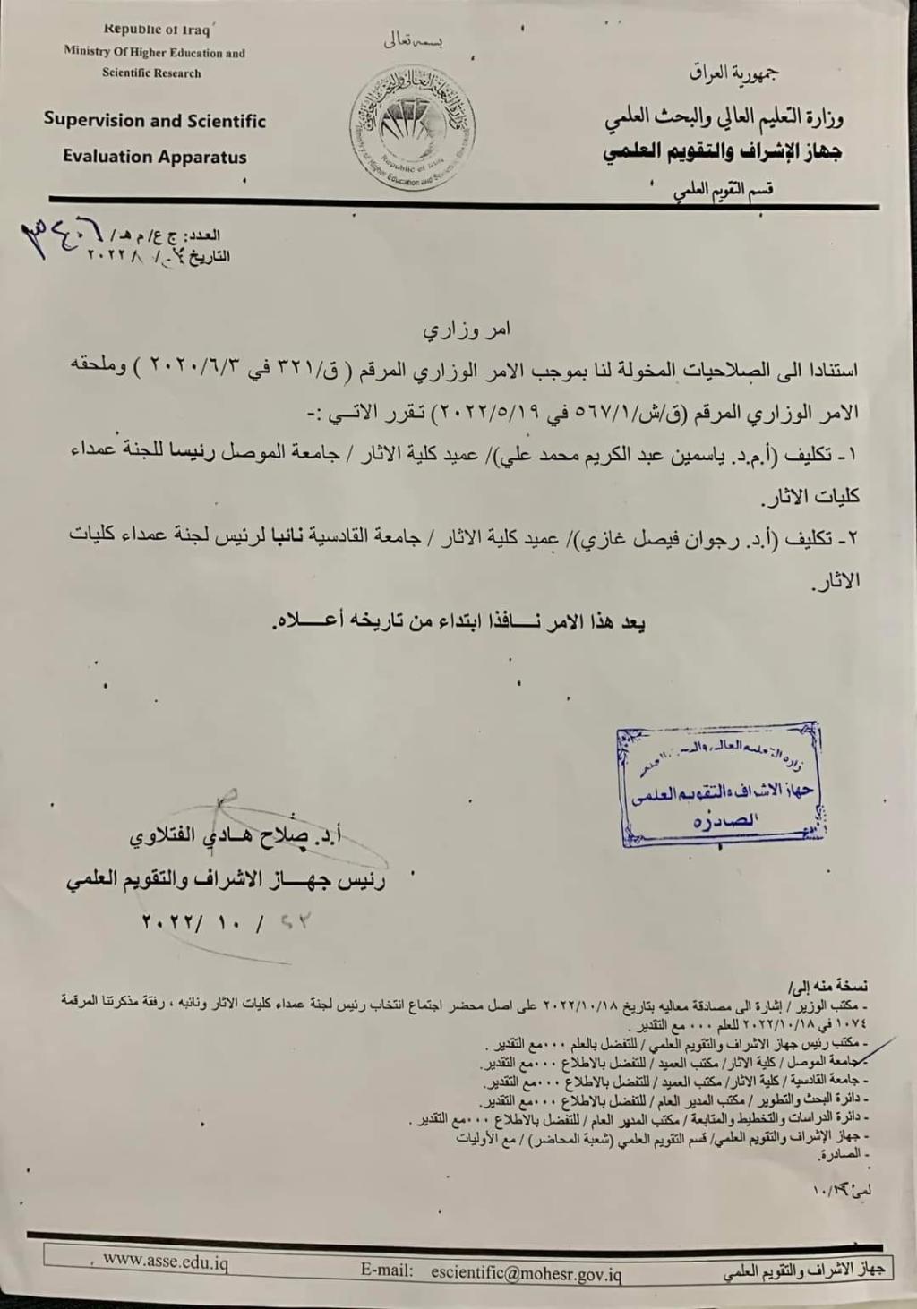 تكليف الاستاذ المساعد الدكتورة ياسمين عبد الكريم عميد كلية الآثار في جامعة الموصل لرئاسة لجنة عمداء كليات الٱثار في الجامعات العراقية