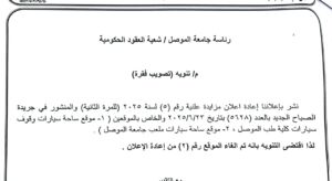 تنوه شعبة العقود الحكومية في رئاسة جامعة الموصل عن إلغاء الفقرة الثانية من جدول المواقع الخاص بإعلان المزايدة العلنية رقم ٥ لسنة ٢٠٢٥ .