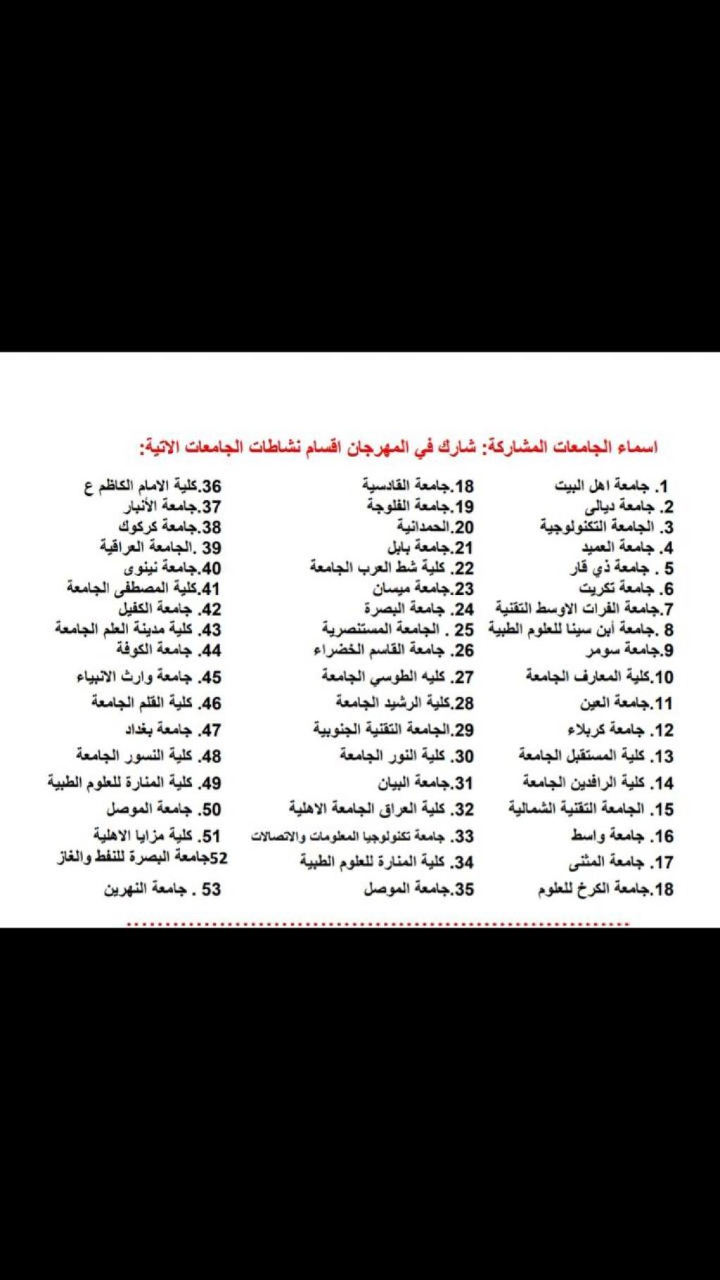 وقد نقل السيد رئيس جهاز الإشراف والتقويم العلمي الدكتور علاء عبد الحسن عطية في كلمته تحية معالي الوزير الأستاذ الدكتور نبيل كاظم عبد الصاحب الى الجامعات المشاركة ورعايته محاور النشاطات الطلابية وتأكيده على ضرورة إيلاء مهارات الطلبة اهتماما كبيرا مبيناً أن حرص وزارة التعليم على ذلك ينطلق من الأهمية التربوية والثقافية ومردوداتها الإيجابية التي تترك أثرا فاعلا في الوسط الجامعي وتسهم في إعادة الحياة الجامعية.