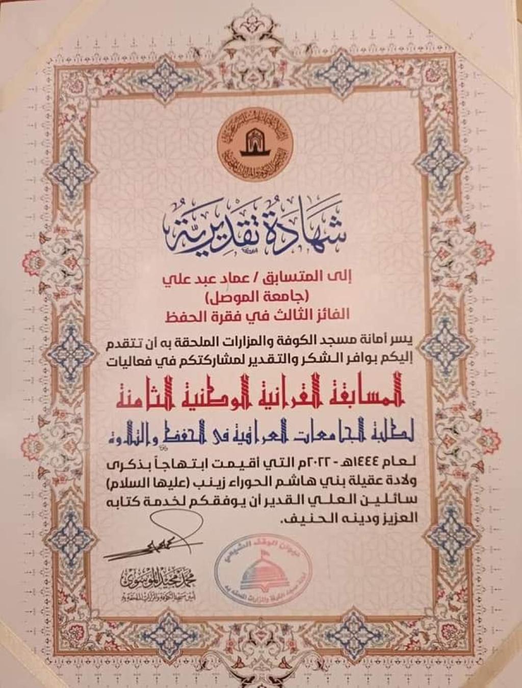 حصلت جامعة الموصل على مراتب متقدمة في مسابقة حفظ وتلاوة القرآن الكريم لجامعات العراق الحكومية والأهلية والتي اقيمت في النجف الاشرف ، حيث حصل الحافظ عماد عبد علي الطالب في كلية الطب جامعة الموصل على المركز الثالث على العراق في فئة حفظ القرآن الكريم كاملا ، وحصل الطالب جواد وعد ارحيل على المرتبة الثالثة على العراق في فئة التلاوة بالطور العراقي.