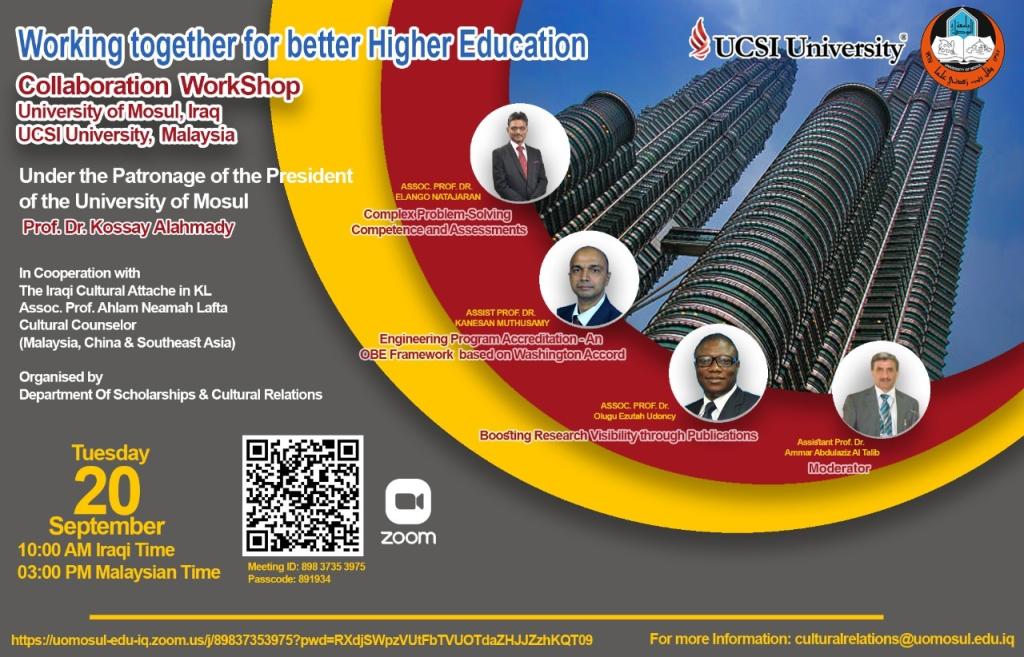 برعاية السيد رئيس جامعة الموصل الاستاذ الدكتور قصي كمال الدين الاحمدي و بالتنسيق مع الملحقية الثقافية للعراق في كوالالمبور عبر الأستاذ المساعد الدكتورة أحلام لفتة الملحق الثقافي لسفارة العراق في ماليزيا،نظم قسم البعثات و العلاقات الثقافية/ شعبة العلاقات الثقافية بالتعاون مع جامعة UCSI الماليزية ورشة عمل إلكترونية مشتركة بعنوان
