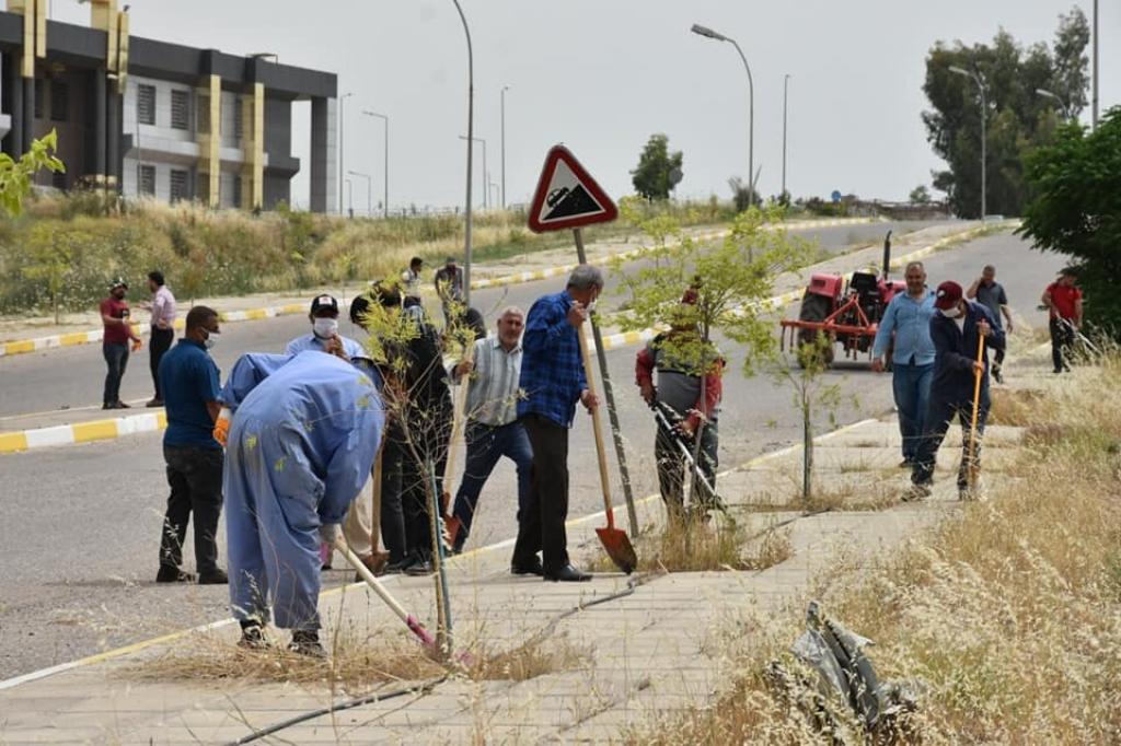 نظمت شعبة الزراعة في قسم شؤون الديوان لرئاسة جامعة الوصل حملة لإدامة الحدائق والمساحات الخضراء بمشاركة الكوادر الفنية في الشعبة .شملت الحملة ادامة وتنظيف الحدائق والمساحات الخضراء داخل الحرم الجامعي وتشذيب الاشجار و النباتات فيها ، والتي ستستمر لعدة ايام .تفقد اعمال الحملة الاستاذ الدكتور قصي كمال الدين الاحمدي الذي اكد بدوره على اهمية المحافظة على جمالية ومظهر المساحات الخضراء لتكون بشكل لائق، من اجل استقبال الطلبة حال اصدار قرار عودة دوامهم بشكل طبيعي من قبل خلية الازمة المركزية بعد اعلانها بإذن الله الانتصار على جائحة كورونا في عراقنا العزيز .
