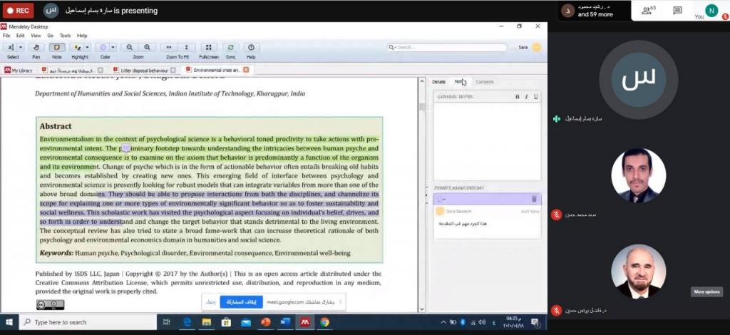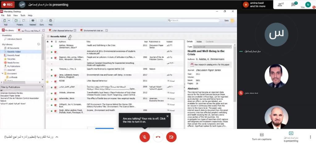 تنفيذاً لتوجيهات السيد رئيس جامعة الموصل الاستاذ الدكتور قصي كمال الدين الاحمدي بضرورة التواصل العلمي وباشراف مباشر من السيدة عميد الكلية أ.م.د. يسرى مجيد الشاكر اقامت كلية علوم البيئة وتقاناتها /قسم علوم البيئة الورشة إلكترونية الموسومة (تنظيم وادارة المراجع العلمية بأستخدام برنامج Mendeley) لتطوير مهارات التدريسيين والباحثين عن بعد, القتها م.م سارة بسام اليوم السبت الموافق 18/4 في تمام الساعة الرابعة عصراً عبر برنامج التطبيق الالكتروني MEET.