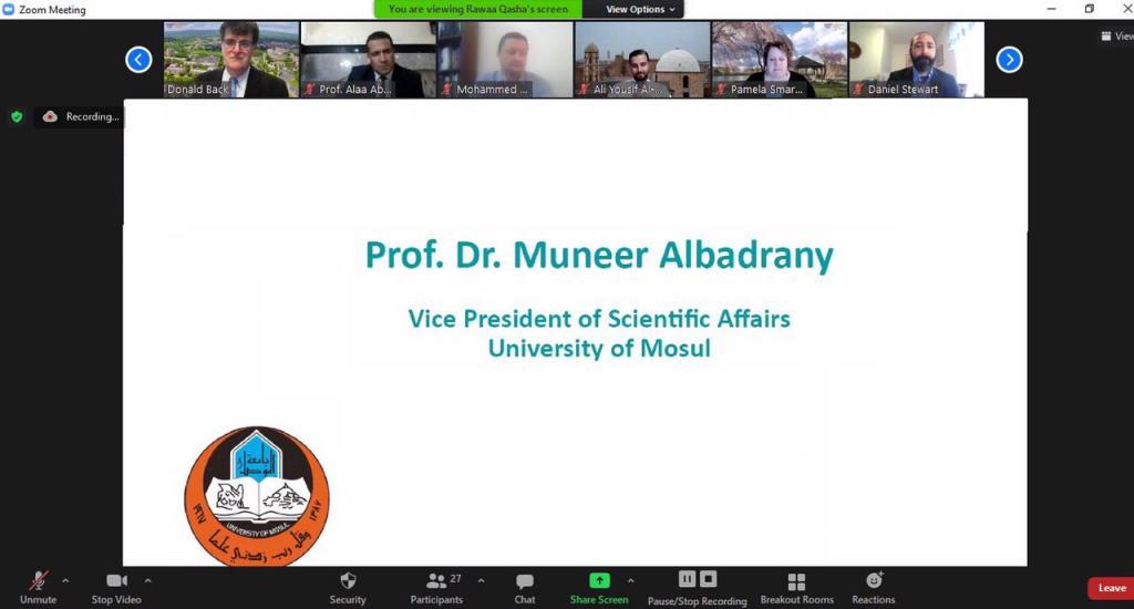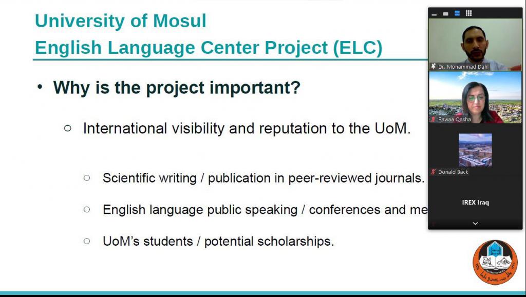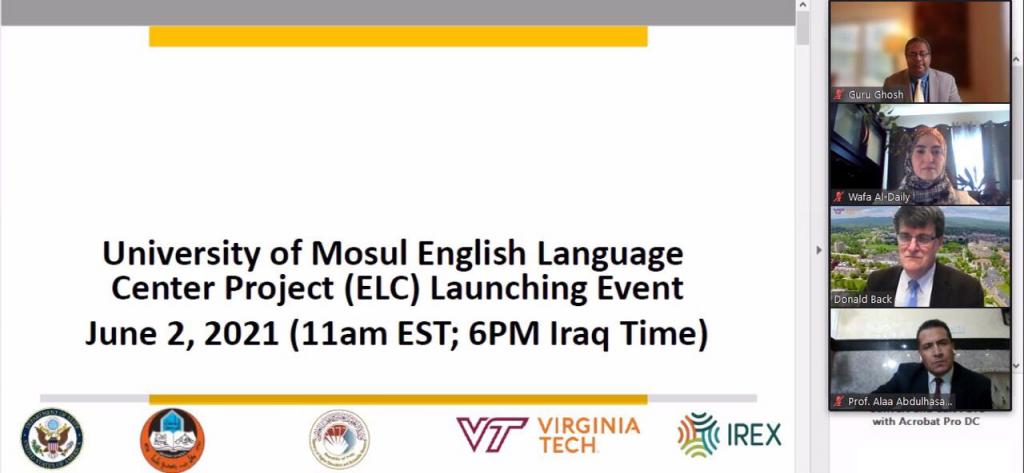 تسعى جامعة الموصل الى التواصل مع المؤسسات التعليمية الدولية المرموقة والرصينة لمواكبة التطورات العلمية وتعمل على تحسين قدرات اعضاء الهيئات التدريسية ومنتسبيها وطلبتها في مختلف المجالات، وفي هذا السياق و بعد عمل متواصل على مدار عام كامل من قبل قسم البعثات والعلاقات الثقافية ووحدة الركن الدولي في رئاسة الجامعة ، تم عبر منصة zoom الإطلاق الرسمي لمشروع مركز اللغة الإنكليزية في الجامعة بالتعاون مع معھد اللغة والثقافة في جامعة فیرجینیا التقنية Virginia Tech English and Culture Institute وبدعم من منظمة آیركس IREX وسفارة الولایات المتحدة في بغداد، وبحضور شخصيات رفیعة المستوى ضمّت كلّ من: الاستاذ الدكتور علاء عبد الحسن / مستشار وزارة التعليم العالي والبحث العلمي والدكتور يوسف خلف و الدكتورة ساھرة موسى / دائرة البحث والتطوير في الوزارة والاستاذ الدكتور منير سالم طه / مساعد رئيس جامعة الموصل للشؤون العلمية والسید دانییل ستیوارت / مدير العلاقات الثقافية في قسم العلاقات العامة في سفارة الولایات المتحدة ، والدكتور غورو كوش / مساعد رئيس الجامعة للعلاقات والشؤون الدولیة في جامعة فیرجینیا التقنية ، والدكتور لوري ماسون / مدیر مشاريع منظمة آیركس في العراق ، فضلاً عن مدیر معھد اللغة والثقافة في جامعة فیرجینیا التقنية وعدد من أساتذته، وكذلك فریق جامعة الموصل .