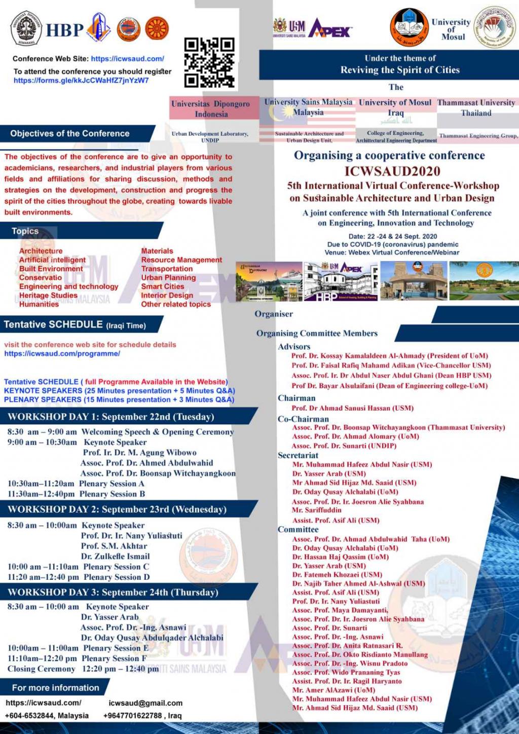 اقامت جامعتا الموصل والعلوم الماليزية مؤتمراً دولياً تحت شعار احياء روح المدن وبعنوان ( العمارة المستدامة والتخطيط الحضري ) ، صباح يوم الثلاثاء الموافق 22 ايلول 2020 ، حضره الاستاذ الدكتور منير سالم طه مساعد رئيس جامعة الموصل للشؤون العلمية ممثلا عن رئيس الجامعة ، وعدد من رؤساء الجامعات المشاركة واساتذة وباحثين من الجامعات العراقية والعربية والدولية .تم القاء البحوث العلمية عن احياء مدينة الموصل القديمة ومواضيع اخرى من قبل اكثر من 25 باحث وباحثة من جامعة الموصل والجامعات العراقية والعالمية الاخرى بشكل الكتروني بسبب جائحة Covid-19 . كما سيتضمن المؤتمر ورشة عمل ومحاضرات علمية عن مدينة الموصل من محاضرين من جامعة الموصل بالإضافة الى مواضيع علمية اخرى من محاضرين من جامعات مؤسسات علمية دولية.
