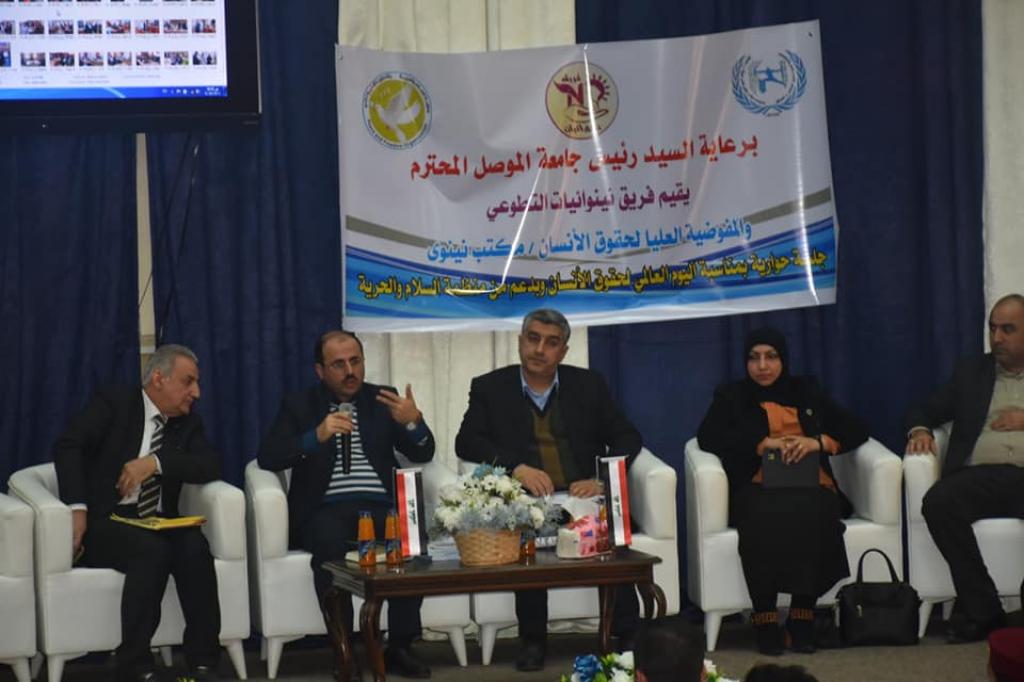برعاية الاستاذ الدكتور قصي كمال الدين الاحمدي رئيس جامعة الموصل وبمناسبة اليوم العالمي لحقوق الانسان أقام فريق نينوائيات التطوعي والمفوضية العليا لحقوق الانسان /مكتب نينوى جلسة حوارية بدعم من منظمة السلام والحرية الاربعاء الموافق 11 كانون الاول 2019 في قاعة كلية التمريض..
