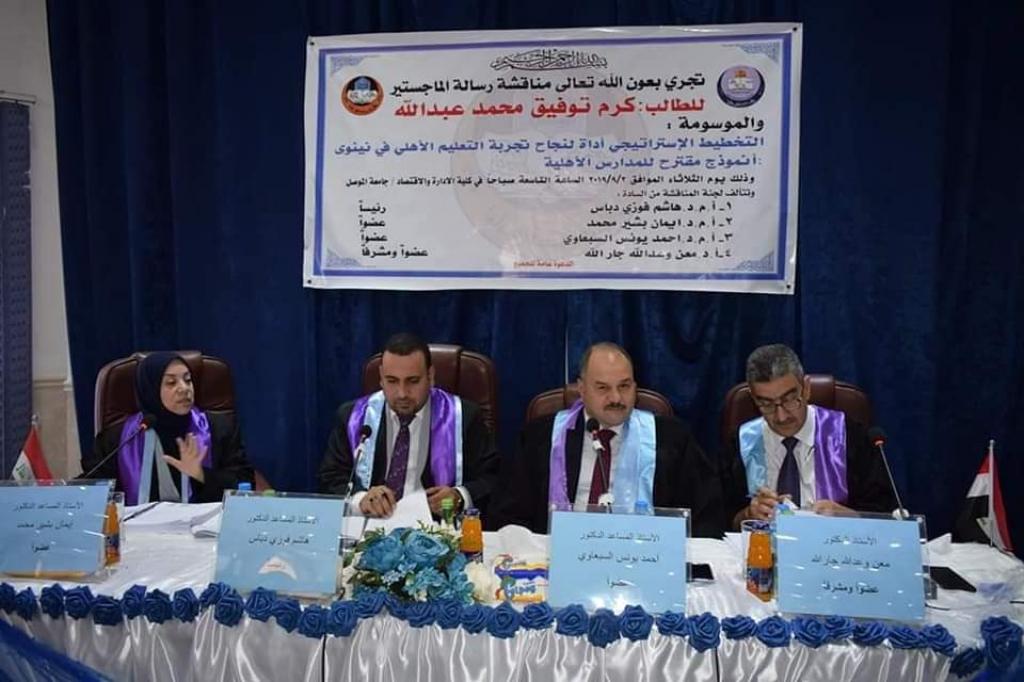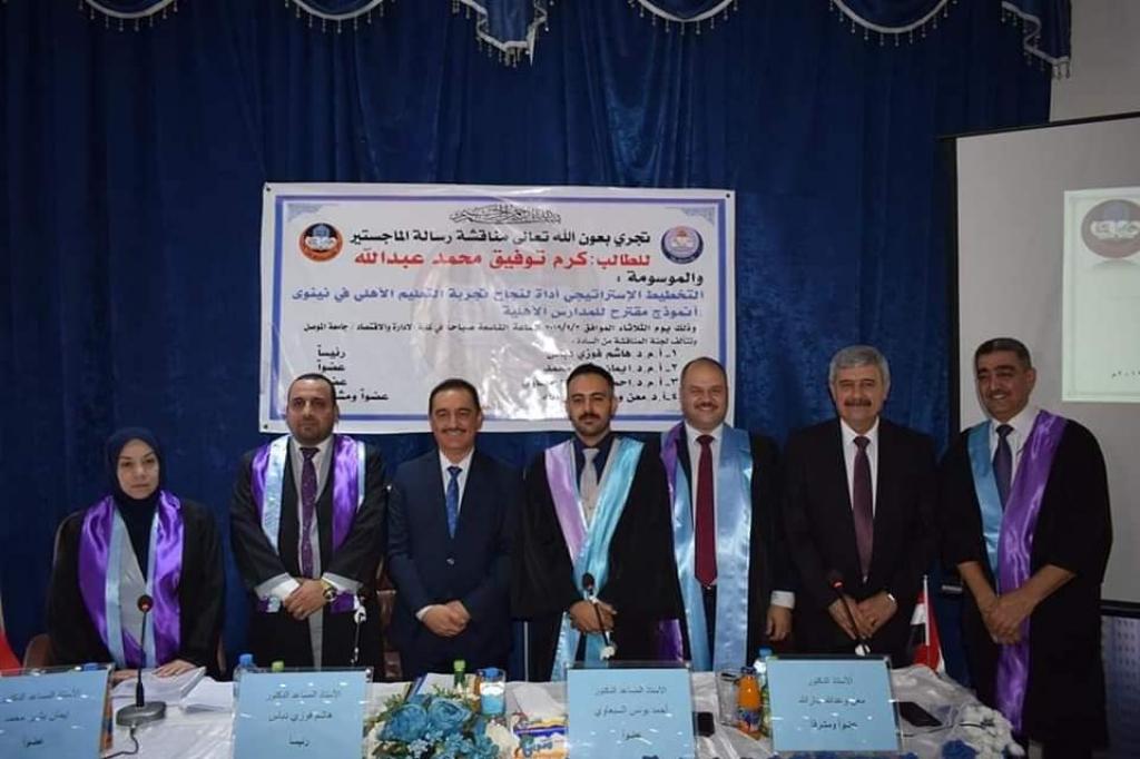 يحرص السيد رئيس جامعة الموصل الاستاذ الدكتور قصي كمال الدين الاحمدي على تفقد مشهد الدراسات العليا فيها بحضوره المستديم لمناقشات الرسائل والاطاريح الجامعية لتكون زيارته اليوم الثلاثاء الموافق 3 ايول 2019 دليلاً على ذلك حيث حضر سيادته جانباً من مناقشة رسالة الماجستير للطالب كرم توفيق محمد عبدالله في كلية الادارة والاقتصاد الموسومة (التخطيط الاستراتيجي ادارة لنجاح تجربة التعليم الاهلي في نينوى انموذجاً مقترحاً للمدارس الاهلية) .. حيث حل الاستاذ الدكتور هاشم فوزي دباس ضيفاً من جامعة الكوفة رئيساً للجنة المناقشة ..