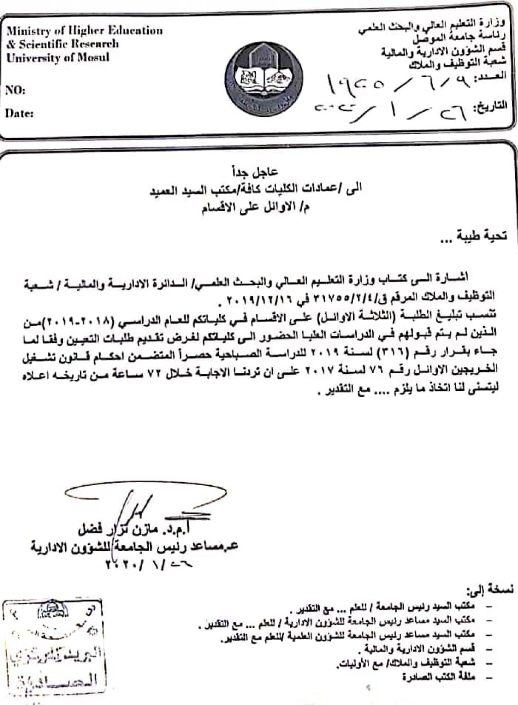 بجهود حثيثة ومتابعة متواصلة وبتوجيهات من السيد رئيس جامعة الموصل الاستاذ الدكتور قصي كمال الدين الاحمدي اصدرت رئاسة الجامعة امراً ادارياً موجها الى عمادات الكليات بخصوص تبليغ الطلبة (الثلاثة الاوائل )على الاقسام في الكليات للعام الدراسي (2018-2019) من الذين لم يتم قبولهم في الدراسات العليا بالحضور الى كلياتهم لغرض تقديم طلبات التعيين وفقاً لما جاء بقرار رقم ( 316) لسنة 2019 للدراسة الصباحية حصراً المتضمن احكام قانون تشغيل الخريجين الاوائل رقم 76 لسنة 2017 على ان ترد الاجابة لرئاسة الجامعة الشؤون الادارية خلال 72 ساعة من تاريخ الامر الصادر بتاريخ اليوم الاحد 26 كانون الثاني 2019. نبارك لخريجي جامعتنا من الطلبة الاوائل المشمولين بذلك صدور الامر الخاص بتعيينهم اعلاه ، ونتمنى لهم التوفيق والنجاح في مسيرتهم العلمية والعملية .