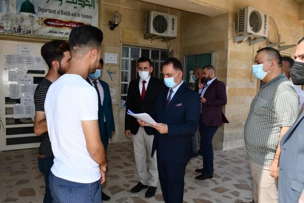 تفقد الاستاذ الدكتور قصي كمال الدين الاحمدي رئيس جامعة الموصل الامتحانات النهائية الحضورية لطلبة كليتي العلوم الاسلامية والآداب صباح اليوم الخميس الموافق 5 آب 2021، مطلعاً على الاجواء الامتحانية وملتقياً بعدد من ابنائه الطلبة في اروقة الكليتين لمعرفة آرائهم وانطباعاتم عن مجريات العملية الامتحانية ، متمنياً لهم دوام التوفيق والنجاح ، كما أكد السيد رئيس الجامعة على ضرورة التعامل الابوي مع الطلبة وتفعيل الاجراءات الصحية الوقائية المتعلقة بفايروس كورونا بما يضمن سلامتهم ، واتخاذ كافة الاجراءات التي من شانها انجاح العملية الامتحانية في جامعة الموصل للعام الدراسي 2020-2021.