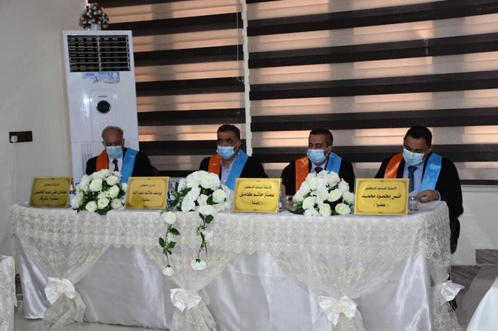 ترأس لجنة المناقشة الأستاذ المساعد الدكتور عمار حاتم كامل من جامعة الأنبار وعضوية كل من الأستاذ المساعد الدكتور أنس محمود محمد والدكتور يوسف هاشم عبد الله وبإشراف وعضوية الأستاذ الدكتور كامل علي عبد المحسن.
