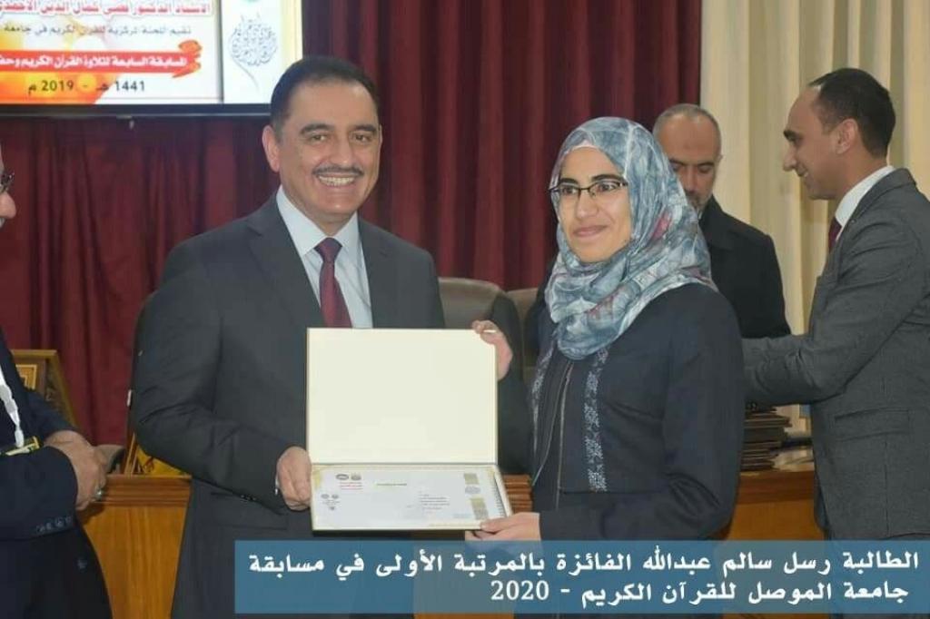 جدير بالذكر ان الطالبة كانت قد حصلت على المركز الأول على مستوى الجامعة لعامين متتاليين في مسابقتها السنوية للقرآن الكريم ، كما تم اختيارها لتمثل العراق على مستوى العنصر النسوي في مسابقة دولية بعد فوزها بمسابقة اقيمت في بغداد وتحقيقها مرتبة متقدمة ضمن الثلاثة الاوائل هي وزميلة لها من الموصل ومتسابقة من ميسان بين 659 مشاركة من مختلف مدن العراق، كما تم تكريمها من قبل القائمين على مسابقة أم الربيعين بنسخة من المصحف الشريف وعمرة إلى بيت الله الحرام و ميدالية فضلا عن شهادة تقديرية.