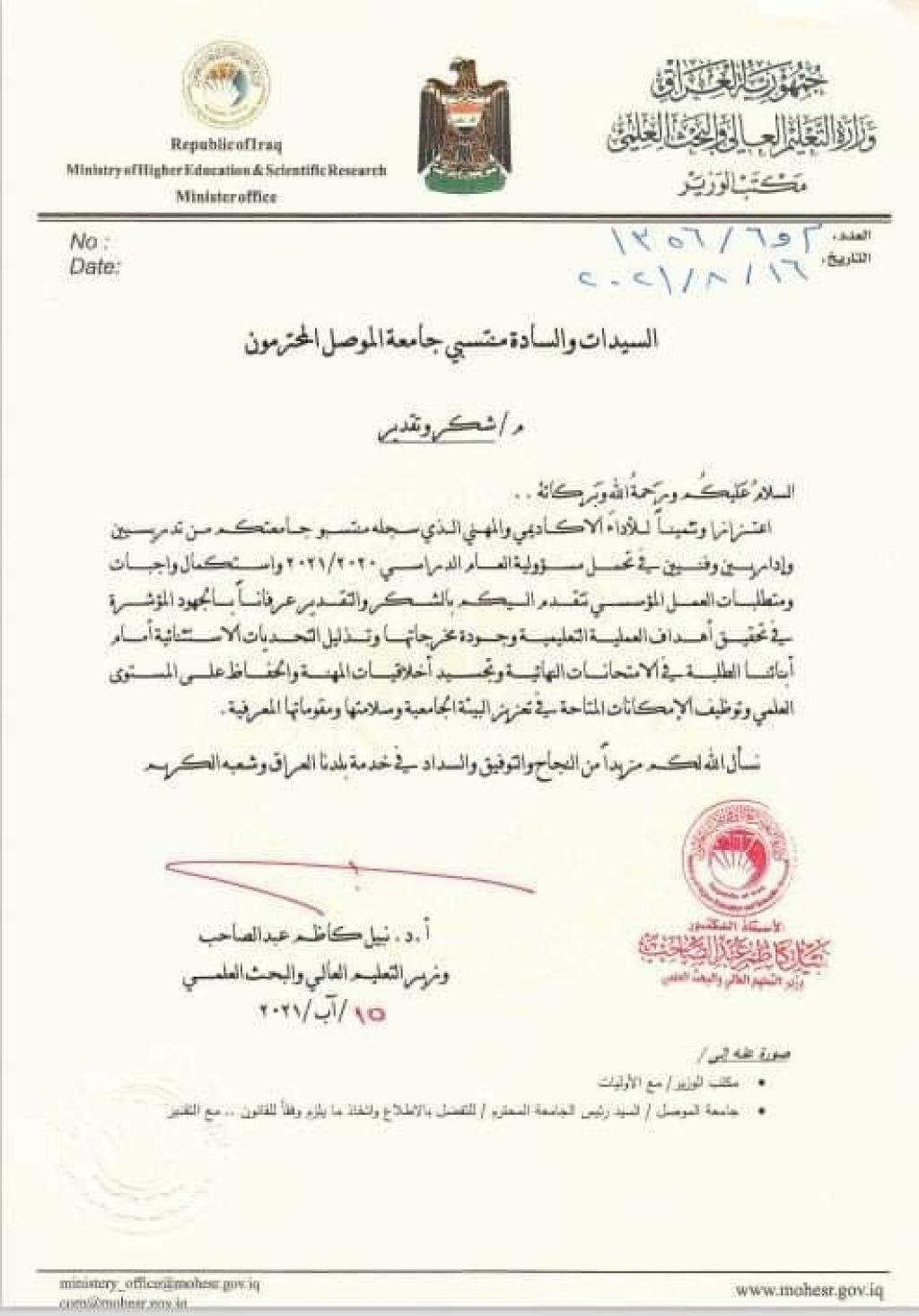 منح الاستاذ الدكتور قصي كمال الدين الأحمدي رئيس جامعة الموصل منتسبي الجامعة من التدريسيين والموظفين قدماً وظيفياً مدته شهراً واحداً لأغراض الترفيع والعلاوة القادمين، استناداً إلى كتاب الشكر والتقدير ذي العدد (م و ٦/1356) في 16/8/2021 الصادر من وزارة التعليم العالي والبحث العلمي / مكتب معالي الوزير، والى الفقرة أولاً من المادة (٢١) من قانون انضباط موظفي الدولة رقم ١٤ لسنة ١٩٩١ المعدل. وعبر الأمر الجامعي ذي العدد 9/10/13300بتاريخ 17/8/2021 .