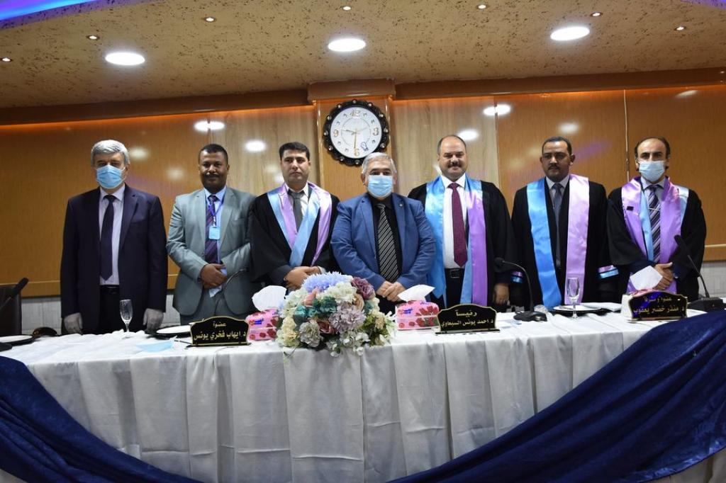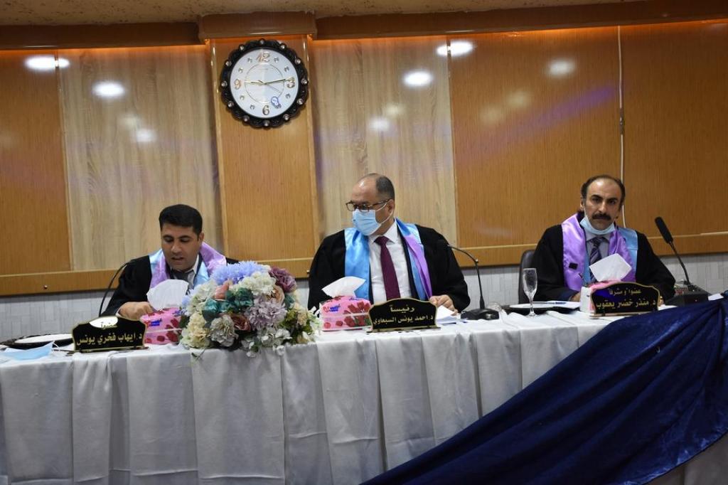 تراس لجنة المناقشة الاستاذ المساعد الدكتور احمد يونس السبعاوي وبعضوية الدكتور ايهاب فخري يونس وبإشراف وعضوية الدكتور منذر خضر يعقوب .