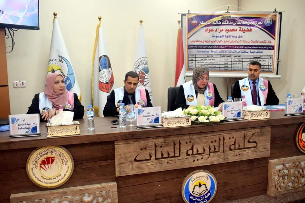 ناقش قسم علوم الحياة بكلية التربية للبنات في جامعة الموصل رسالة الماجستير الموسومة (عزل وتشخيص الطفيليات من عينات الادرار للمرضى المصابين بالتهاب المجاري البولية في محافظة نينوى) ، يوم الثلاثاء الموافق ٨ / ١١ / ٢٠٢٢ .