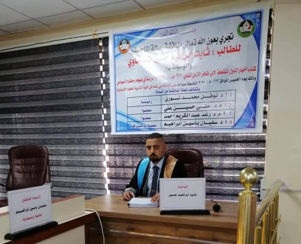 ناقشت كلية التربية للعلوم الانسانية رسالة ماجستير عن (كتاب أخبار الدول المنقطعة لابن ظافر الأزدي المتوفَى سنة (613هــ/1216م))، يوم الخميس الموافق ١٣ / آب / ٢٠٢٠ وعلى قاعة ابي تمام في الكلية