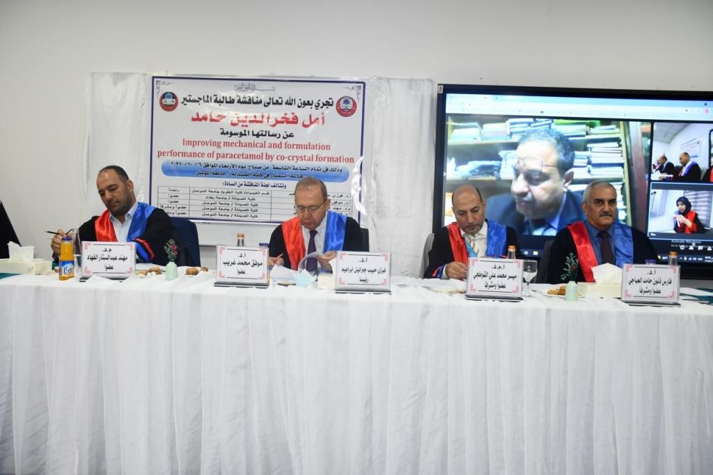 رسالة ماجستير بكلية الصيدلة عن تحسين الأداء الميكانيكي والتركيبي للباراسيتامولناقشت كلية الصيدلة في جامعة الموصل رسالة ماجستير عن تحسين الأداء الميكانيكي والتركيبي للباراسيتامول عن طريق تكوين البلورة المشتركة ، يوم الاربعاء 6 تشرين الاول 2021 ، حضر جانبا منها السيد رئيس الجامعة الاستاذ الدكتور قصي كمال الدين الاحمدي والسيدة عميد الكلية الاستاذ المساعد الدكتورة زينة عبدالمنعم عبدالمجيد.