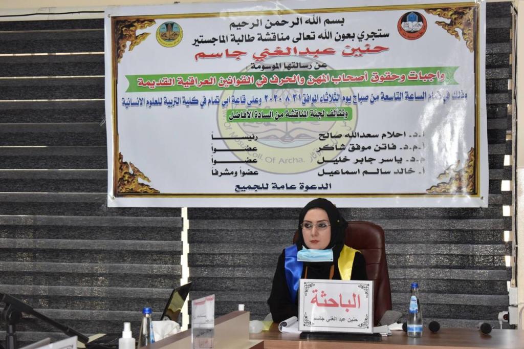ناقشت كلية الاثار بجامعة الموصل رسالة ماجستير عن (واجبات وحقوق اصحاب المهن والحرف في القوانين العراقية القديمة)، يوم 31 أب 2020، على قاعة ابي تمام في كلية التربية للعوم الانسانية، بحضور ا.م.د ياسمين عبدالكريم عميد كلية الاثار.